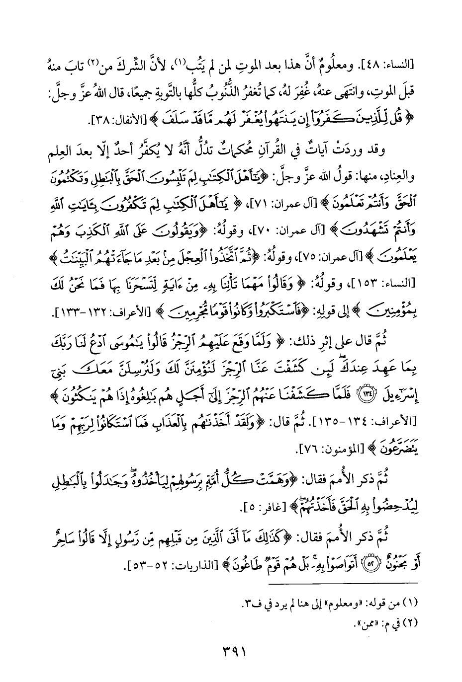 [النساء: ٤٨]. ومعلُومٌ أنَّ هذا بعد الموتِ لمن لم يَتُب (¬١)، لأنَّ الشِّركَ من (¬٢) تابَ منهُ قبلَ الموتِ، وانتَهَى عنهُ، غُفِرَ لهُ، كما تُغفرُ الذُّنُوبُ كلُّها بالتَّوبةِ جميعًا، قال اللَّهُ عزَّ وجلَّ: {قُلْ لِلَّذِينَ كَفَرُوا إِنْ يَنْتَهُوا يُغْفَرْ لَهُمْ مَا قَدْ سَلَفَ} [الأنفال: ٣٨].