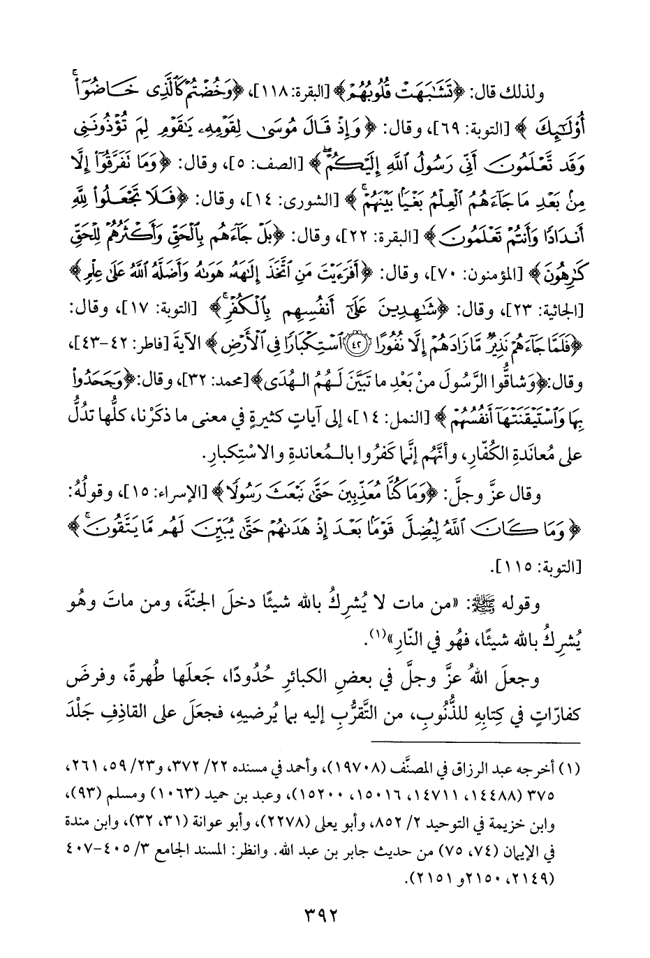 ولذلك قال: {تَشَابَهَتْ قُلُوبُهُمْ} [البقرة: ١١٨]، {وَخُضْتُمْ كَالَّذِي خَاضُوا أُولَئِكَ} [التوبة: ٦٩]، وقال: {وَإِذْ قَالَ مُوسَى لِقَوْمِهِ يَاقَوْمِ لِمَ تُؤْذُونَنِي وَقَدْ تَعْلَمُونَ أَنِّي رَسُولُ اللَّهِ إِلَيْكُمْ} [الصف: ٥]، وقال: {وَمَا تَفَرَّقُوا إِلَّا مِنْ بَعْدِ مَا جَاءَهُمُ الْعِلْمُ بَغْيًا بَيْنَهُمْ} [الشورى: ١٤]، وقال: {فَلَا تَجْعَلُوا لِلَّهِ أَنْدَادًا وَأَنْتُمْ تَعْلَمُونَ} [البقرة: ٢٢]، وقال: {بَلْ جَاءَهُمْ بِالْحَقِّ وَأَكْثَرُهُمْ لِلْحَقِّ كَارِهُونَ} [المؤمنون: ٧٠]، وقال: {أَفَرَأَيْتَ مَنِ اتَّخَذَ إِلَهَهُ هَوَاهُ وَأَضَلَّهُ اللَّهُ عَلَى عِلْمٍ} [الجاثية: ٢٣]، وقال: {شَاهِدِينَ عَلَى أَنْفُسِهِمْ بِالْكُفْرِ} [التوبة: ١٧]، وقال: {فَلَمَّا جَاءَهُمْ نَذِيرٌ مَا زَادَهُمْ إِلَّا نُفُورًا (٤٢) اسْتِكْبَارًا فِي الْأَرْضِ} الآيةَ [فاطر: ٤٢ - ٤٣]، وقال: {وَشَاقُّوا الرَّسُولَ مِنْ بَعْدِ مَا تَبَيَّنَ لَهُمُ الْهُدَى} [محمد: ٣٢]، وقال: {وَجَحَدُوا بِهَا وَاسْتَيْقَنَتْهَا أَنْفُسُهُمْ} [النمل: ١٤]، إلى آياتٍ كثيرةٍ في معنى ما ذكَرْنا، كلُّها تدُلُّ على مُعانَدةِ الكُفّارِ، وأنَّهُم إنَّما كَفرُوا بالمُعاندةِ والاسْتِكبارِ.
