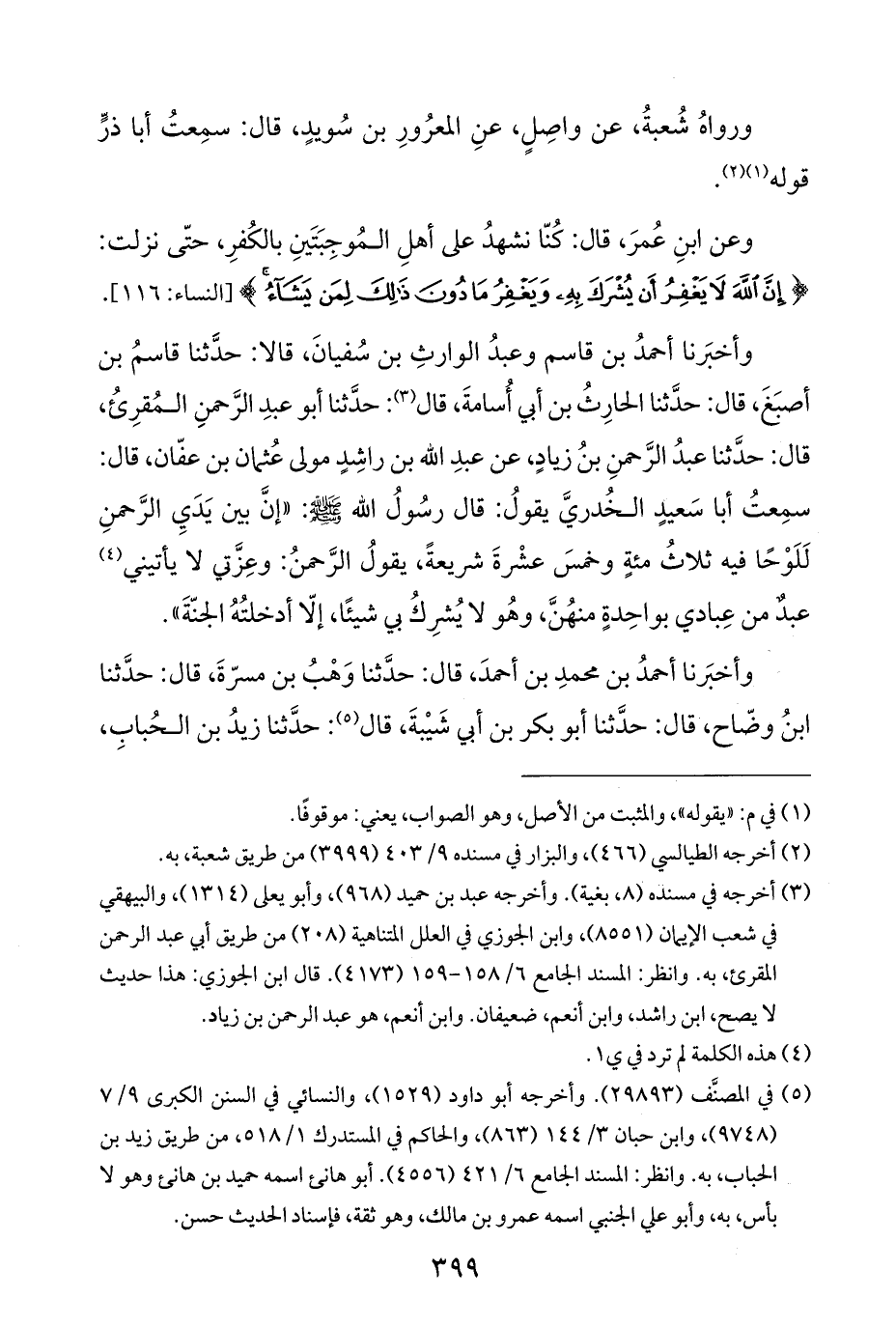وعن ابنِ عُمرَ، قال: كُنّا نشهدُ على أهلِ المُوجِبَتَينِ بالكُفرِ، حتّى نزلت: {إِنَّ اللَّهَ لَا يَغْفِرُ أَنْ يُشْرَكَ بِهِ وَيَغْفِرُ مَا دُونَ ذَلِكَ لِمَنْ يَشَاءُ} [النساء: ١١٦].