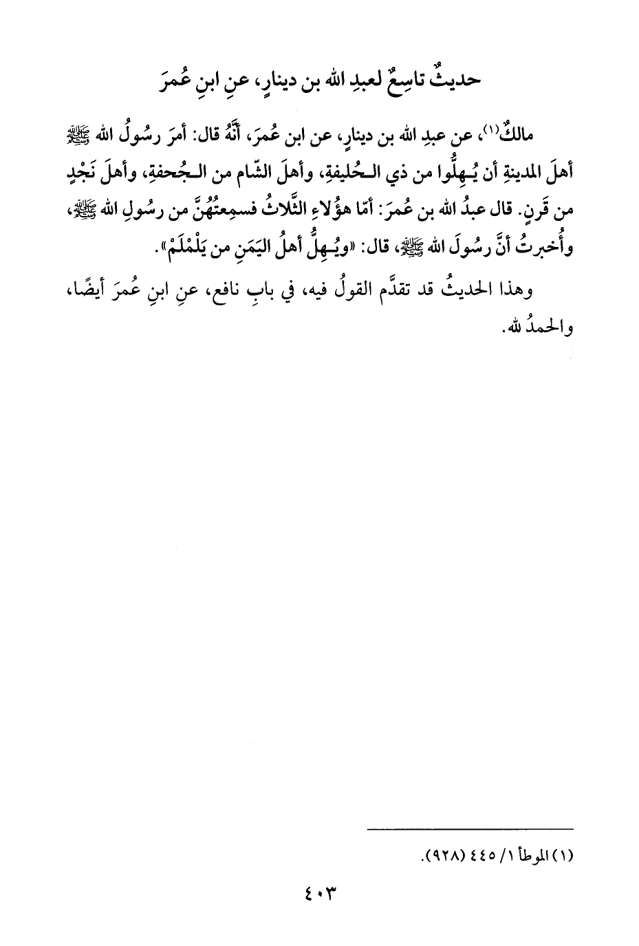 مالكٌ (¬١)، عن عبدِ اللَّه بن دينارٍ، عن ابن عُمرَ، أنَّهُ قال: أمرَ رسُولُ اللَّه -صلى اللَّه عليه وسلم- أهلَ المدينةِ أن يُهِلُّوا من ذي الحُليفةِ، وأهلَ الشّام من الجُحفةِ، وأهلَ نَجْدٍ من قَرنٍ. قال عبدُ اللَّه بن عُمرَ: أمّا هؤُلاءِ الثَّلاثُ فسمِعتُهُنَّ من رسُولِ اللَّه -صلى اللَّه عليه وسلم-، وأُخبرتُ أنَّ رسُولَ اللَّه -صلى اللَّه عليه وسلم-، قال: "ويُهِلُّ أهلُ اليَمَنِ من يَلْمْلَمْ".