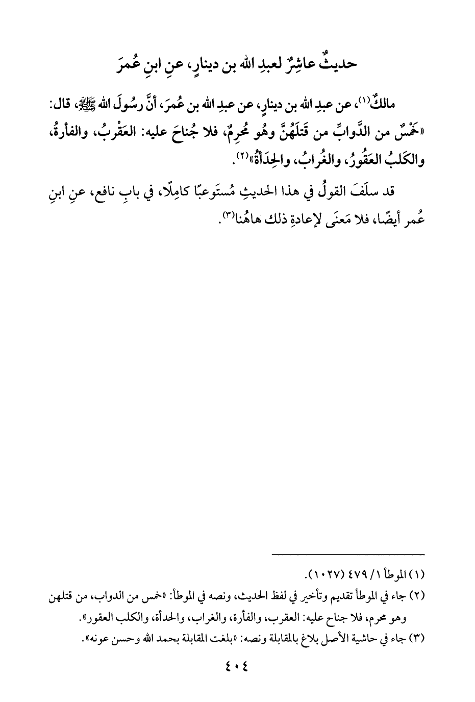 مالكٌ (¬١)، عن عبدِ اللَّه بن دينارٍ، عن عبدِ اللَّه بن عُمرَ، أنَّ رسُولَ اللَّه -صلى اللَّه عليه وسلم-، قال: "خَمْسٌ من الدَّوابِّ من قَتلَهُنَّ وهُو مُحرِمٌ، فلا جُناحَ عليه: العَقْربُ، والفأرةُ، والكَلبُ العَقُورُ، والغُرابُ، والحِدَأةُ" (¬٢).