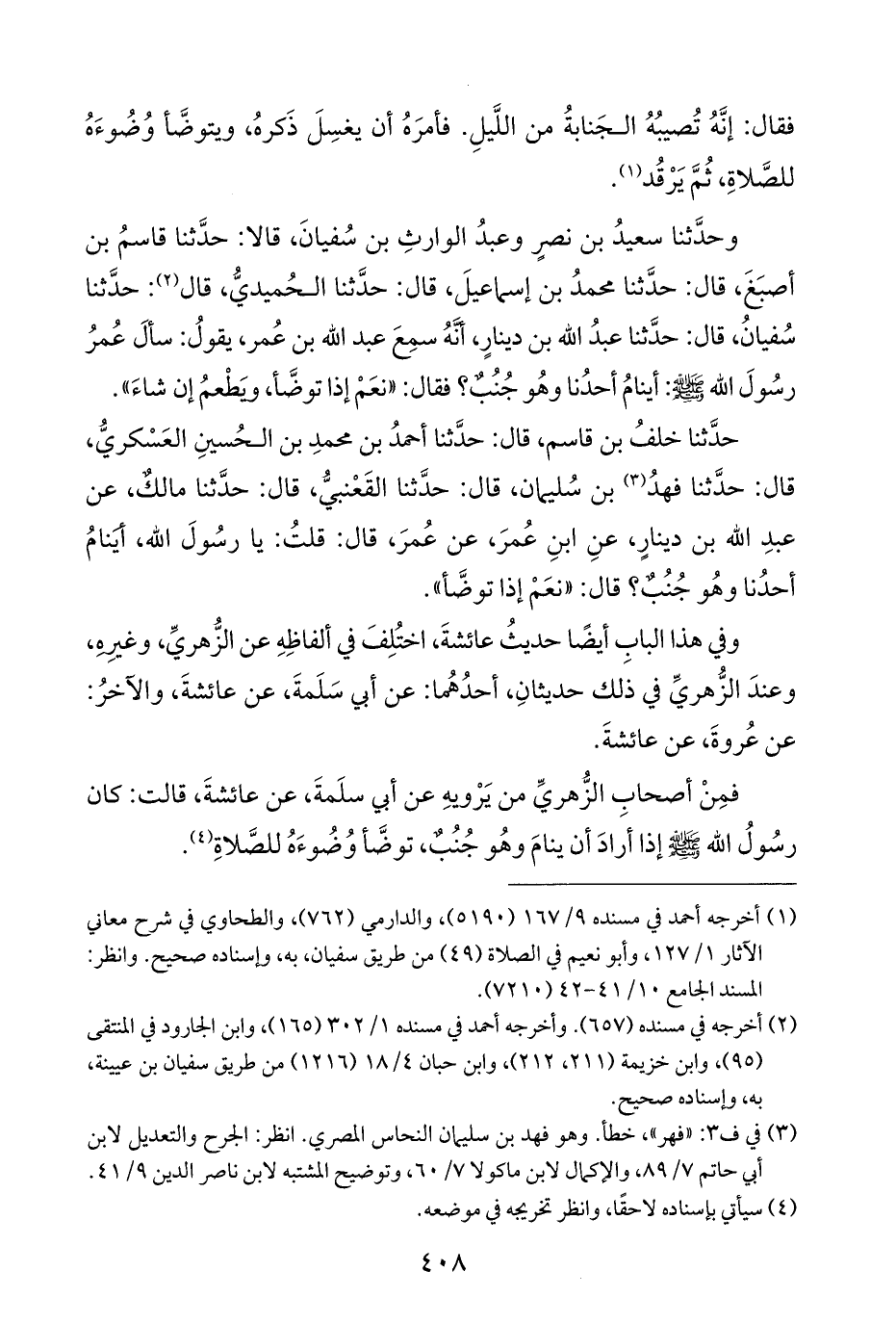 وحدَّثنا سعيدُ بن نصرٍ وعبدُ الوارثِ بن سُفيانَ، قالا: حدَّثنا قاسمُ بن أصبَغَ، قال: حدَّثنا محمدُ بن إسماعيلَ، قال: حدَّثنا الحُميديُّ، قال (¬٢): حدَّثنا سُفيانُ، قال: حدَّثنا عبدُ اللَّه بن دينارٍ، أنَّهُ سمِعَ عبد اللَّه بن عُمر، يقولُ: سألَ عُمرُ رسُولَ اللَّه -صلى اللَّه عليه وسلم-: أينامُ أحدُنا وهُو جُنُبٌ؟ فقال: "نعَمْ إذا توضَّأ، ويَطْعمُ إن شاءَ".
