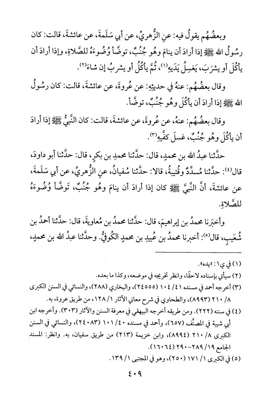 حدَّثنا عبدُ اللَّه بن محمدٍ، قال: حدَّثنا محمدِ بن بكرٍ، قال: حدَّثنا أبو داودَ، قال (¬٤): حدَّثنا مُسدَّدٌ وقُتيبةُ، قالا: حدَّثنا سُفيانُ، عنِ الزُّهريِّ، عن أبي سَلَمةَ، عن عائشةَ، أنَّ النَّبيَّ -صلى اللَّه عليه وسلم- كان إذا أرادَ أن ينامَ وهُو جُنُبٌ، تَوضَّأ وُضُوءَهُ للصَّلاةِ.