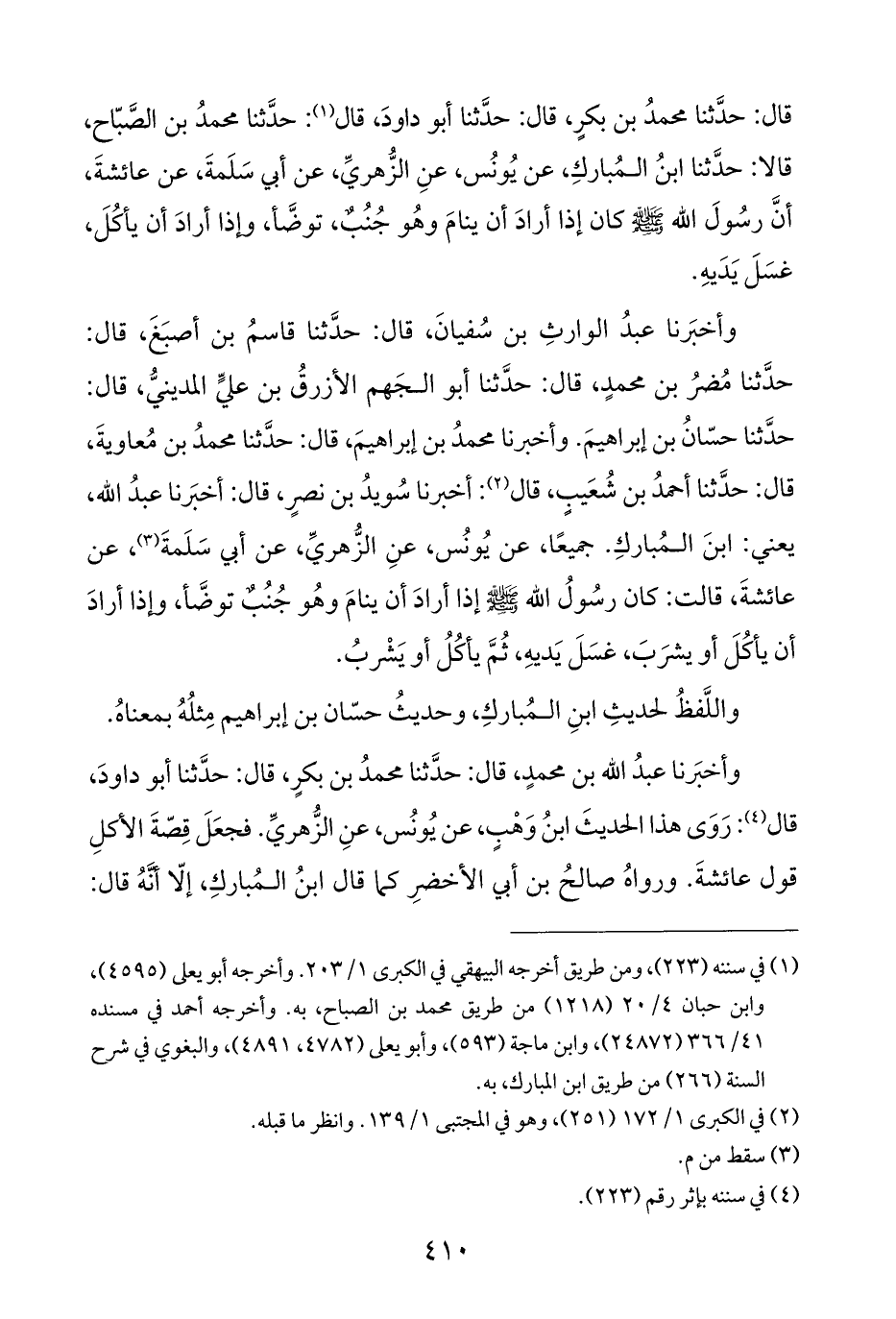 قال: حدَّثنا محمدُ بن بكرٍ، قال: حدَّثنا أبو داودَ، قال (¬١): حدَّثنا محمدُ بن الصَّبّاح، قالا: حدَّثنا ابنُ المُباركِ، عن يُونُس، عنِ الزُّهريِّ، عن أبي سَلَمةَ، عن عائشةَ، أنَّ رسُولَ اللَّه -صلى اللَّه عليه وسلم- كان إذا أرادَ أن ينامَ وهُو جُنُبٌ، توضَّأ، وإذا أرادَ أن يأكُلَ، غسَلَ يَدَيهِ.