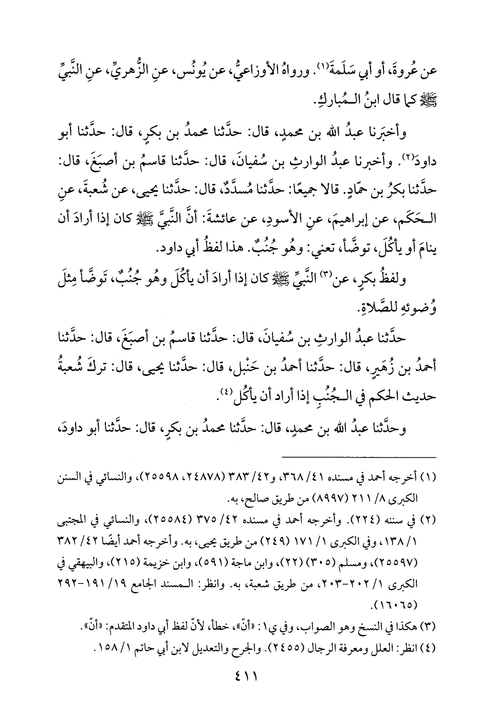 وأخبَرنا عبدُ اللَّه بن محمدٍ، قال: حدَّثنا محمدُ بن بكرٍ، قال: حدَّثنا أبو داودَ (¬٢). وأخبرنا عبدُ الوارثِ بن سُفيانَ، قال: حدَّثنا قاسمُ بن أصبَغَ، قال: حدَّثنا بكرُ بن حمّادٍ. قالا جميعًا: حدَّثنا مُسدَّدٌ، قال: حدَّثنا يحيى، عن شُعبةَ، عنِ الحَكَم، عن إبراهيمَ، عنِ الأسودِ، عن عائشةَ: أنَّ النَّبيَّ -صلى اللَّه عليه وسلم- كان إذا أرادَ أن ينامَ أو يأكُلَ، توضَّأ، تعني: وهُو جُنُبٌ. هذا لفظُ أبي داود.