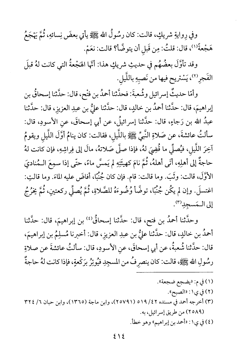 وأمّا حديثٌ إسرائيل وشُعبةَ: فحدَّثنا أحمدُ بن فتْح، قال: حدَّثنا إسحاقُ بن إبراهيمَ، قال: حدَّثنا أحمدُ بن خالدٍ، قال: حدَّثنا عليُّ بن عبدِ العزيزِ، قال: حدَّثنا عبدُ اللَّه بن رَجاءٍ، قال: حدَّثنا إسرائيلُ، عن أبي إسحاقَ، عنِ الأسودِ، قال: سألتُ عائشةَ، عن صَلاةِ النَّبيِّ -صلى اللَّه عليه وسلم- باللَّيلِ، فقالت: كان ينامُ أوَّلَ اللَّيلِ ويقومُ آخِرَ اللَّيلِ، فيُصلِّي ما قُضِيَ لهُ، فإذا صلَّى صَلاتهُ، مالَ إلى فِراشِهِ، فإن كانت لهُ حاجةٌ إلى أهلِهِ، أتَى أهلهُ، ثُمَّ نامَ كهيئَتِهِ لم يَمسَّ ماءً، حتّى إذا سمِعَ المُناديَ الأوَّلَ، قالت: وثَبَ. وما قالت: قام. فإن كان جُنُبًا، أفاضَ عليه الماءَ. وما قالتِ: اغتسلَ. وإن لم يكُن جُنُبًا، توضَّأ وُضُوءَهُ للصَّلاةِ، ثُمَّ يُصلِّي ركعتينِ، ثُمَّ يخرُجُ إلى المَسجِدِ (¬٣).