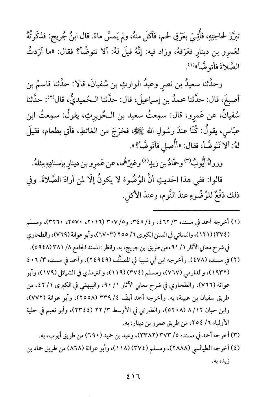 وحدَّثنا سعيدُ بن نصرٍ وعبدُ الوارثِ بن سُفيانَ، قالا: حدَّثنا قاسمُ بن أصبغَ، قال: حدَّثنا محمدُ بن إسماعيلَ، قال: حدَّثنا الحُميديُّ، قال (¬٢): حدَّثنا سُفيانُ، عن عَمرٍو، قال: سمِعتُ سعيد بن الحُويرِثِ، يقولُ: سمِعتُ ابن عبّاسٍ، يقولُ: كُنّا عندَ رسُول اللَّه -صلى اللَّه عليه وسلم-، فخرَجَ من الغائطِ، فأتي بطعام، فقيلَ لهُ: ألا تَتَوضَّأ، فقال: "أأُصلي فأتَوضَّأ؟ ".
