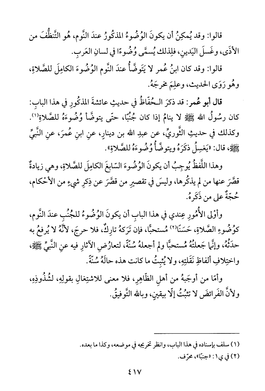 وأوْلى الأُمُورِ عِندي في هذا البابِ أن يكونَ الوُضُوءُ للجُنُبِ عندَ النَّوم، كوُضُوءِ الصَّلاةِ، حَسَنًا (¬٢) مُستحبًّا، فإن تَرَكهُ تارِكٌ، فلا حرجَ، لأنَّهُ لا يُرفعُ به حدَثُهُ، وإنَّما جَعلتُهُ مُستحبًّا ولم أجعلهُ سُنّةً، لتعارُضِ الآثارِ فيه عنِ النَّبيِّ -صلى اللَّه عليه وسلم-، واختِلافِ ألفاظِ نَقَلتِهِ، ولا يُثبِتُ ما كانت هذه حالَهُ سُنّةً.