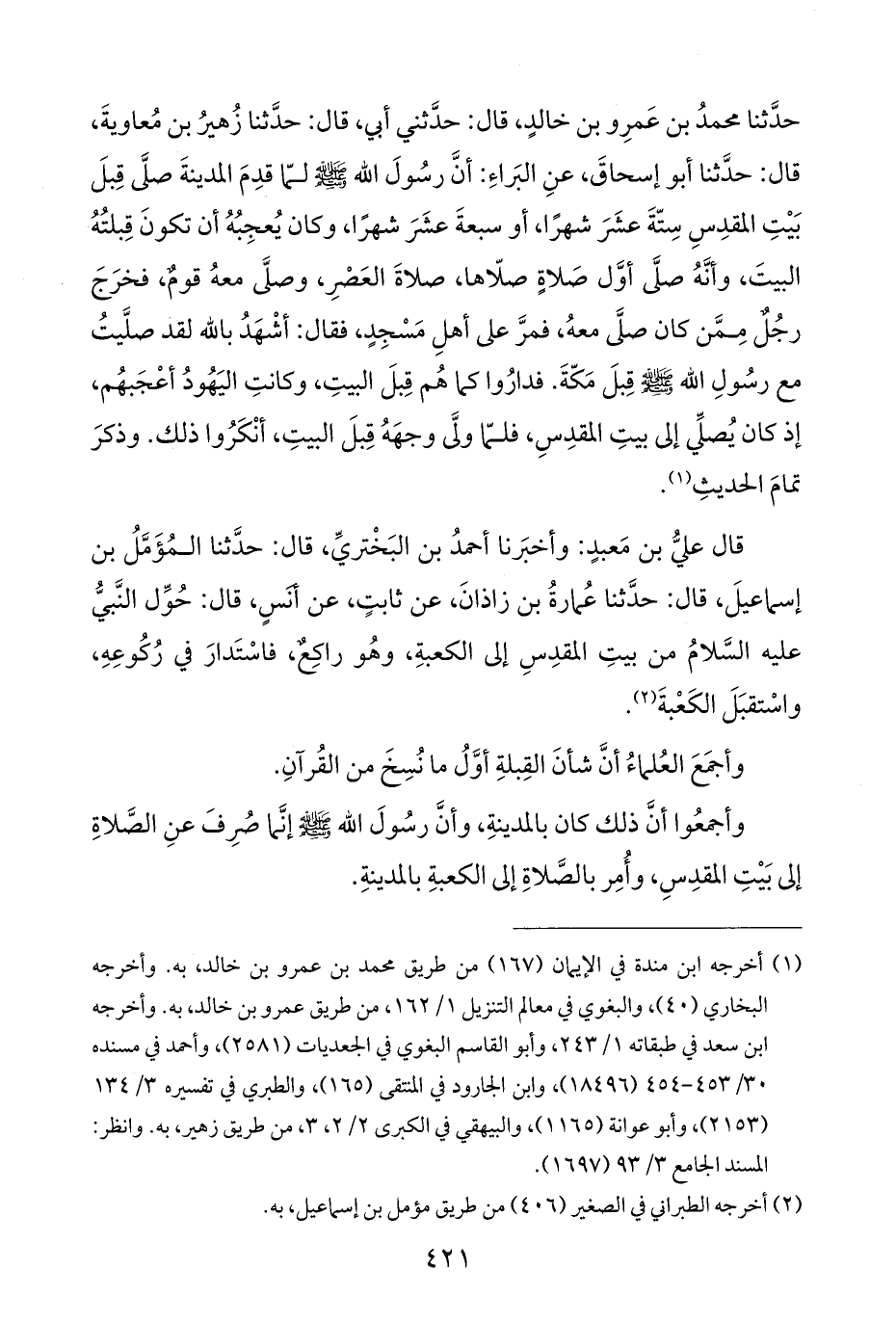 حدَّثنا محمدُ بن عَمرِو بن خالدٍ، قال: حدَّثني أبي، قال: حدَّثنا زُهيرُ بن مُعاويةَ، قال: حدَّثنا أبو إسحاقَ، عنِ البَراءِ: أنَّ رسُولَ اللَّه -صلى اللَّه عليه وسلم- لمّا قدِمَ المدينةَ صلَّى قِبلَ بَيْتِ المقدِسِ سِتّةَ عشَرَ شهرًا، أو سبعةَ عشَرَ شهرًا، وكان يُعجِبُهُ أن تكونَ قِبلتُهُ البيتَ، وأنَّهُ صلَّى أوَّل صَلاةٍ صلّاها، صلاةَ العَصْرِ، وصلَّى معهُ قومٌ، فخرَجَ رجُل مِمَّن كان صلَّى معهُ، فمرَّ على أهلِ مَسْجِدٍ، فقال: أشْهَدُ باللَّه لقد صلَّيتُ مع رسُولِ اللَّه -صلى اللَّه عليه وسلم- قِبلَ مَكّةَ. فدارُوا كما هُم قِبلَ البيتِ، وكانتِ اليَهُودُ أعْجَبهُم، إذ كان يُصلِّي إلى بيتِ المقدِسِ، فلمّا ولَّى وجهَهُ قِبلَ البيتِ، أنْكَرُوا ذلك. وذكرَ تمامَ الحديثِ (¬١).