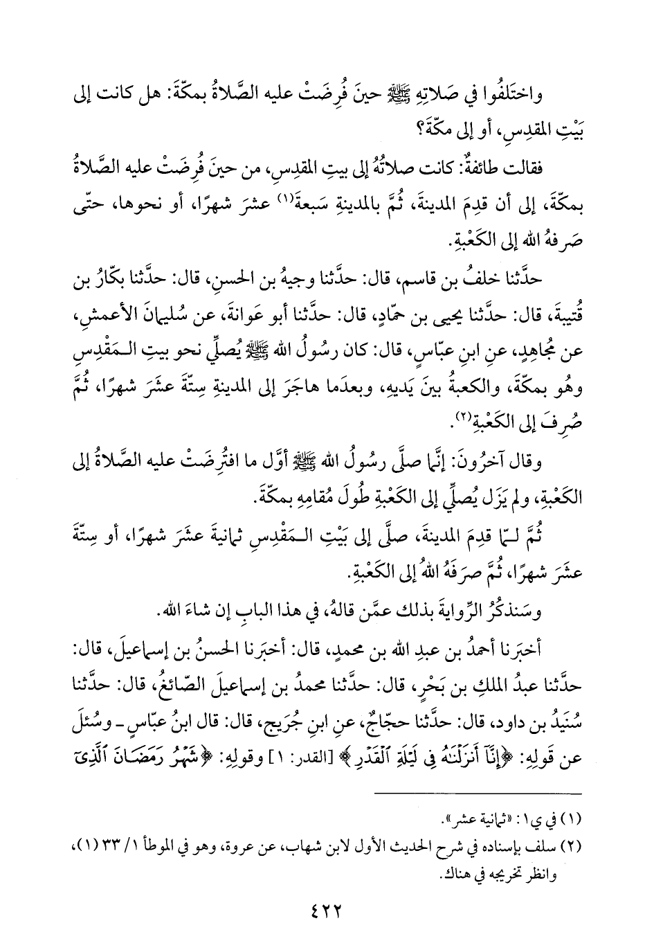 حدَّثنا خلفُ بن قاسم، قال: حدَّثنا وجيهُ بن الحسنِ، قال: حدَّثنا بكّارُ بن قُتيبةَ، قال: حدَّثنا يحيى بن حمّادٍ، قال: حدَّثنا أبو عَوانةَ، عن سُليمانَ الأعمشِ، عن مُجاهِدٍ، عنِ ابنِ عبّاسٍ، قال: كان رسُولُ اللَّه -صلى اللَّه عليه وسلم- يُصلِّي نحو بيتِ المَقْدِسِ وهُو بمكّةَ، والكعبةُ بينَ يَديهِ، وبعدَما هاجَرَ إلى المدينةِ سِتّةَ عشَرَ شهرًا، ثُمَّ صُرِفَ إلى الكَعْبةِ (¬٢).