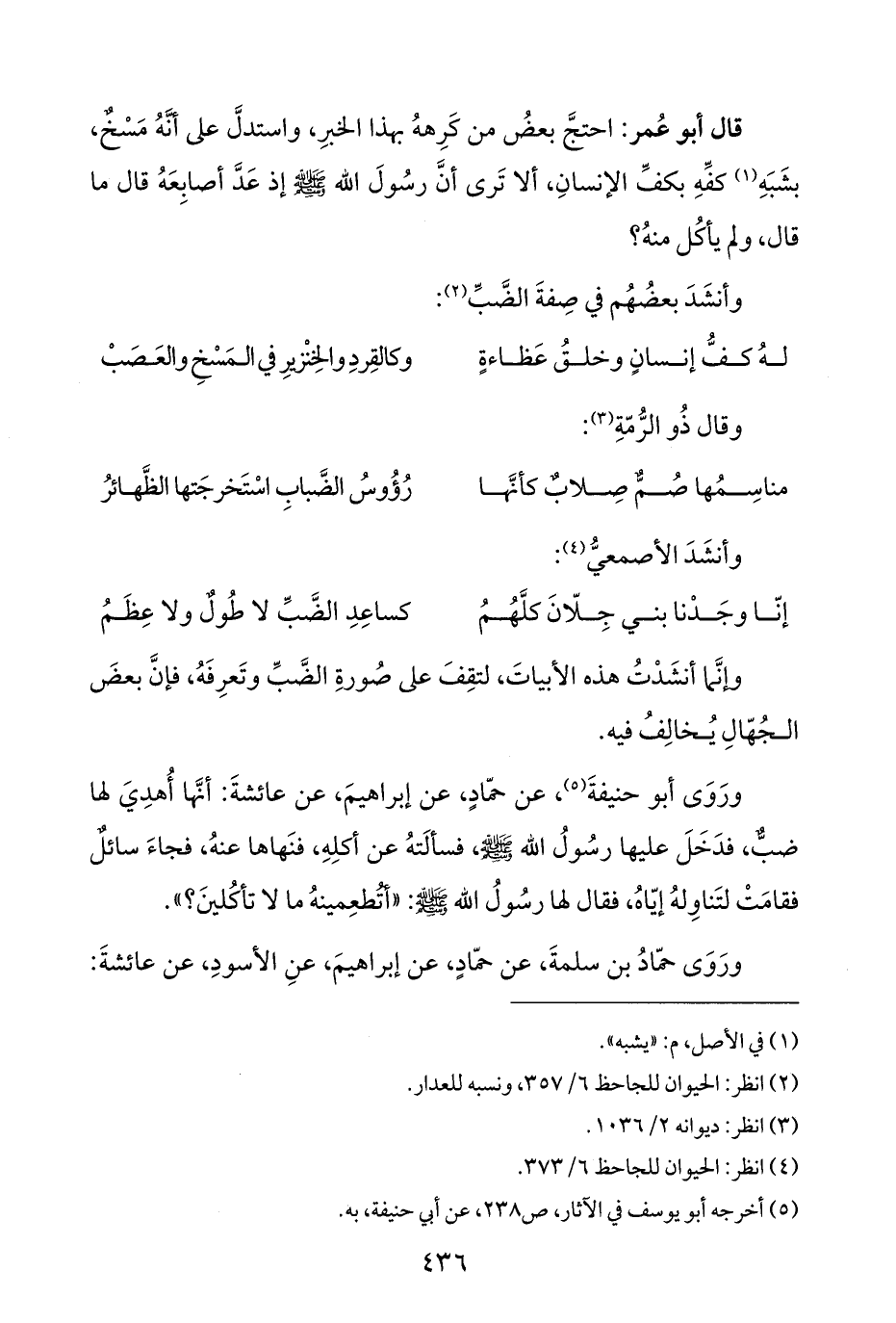 ورَوَى أبو حنيفةَ (¬٥)، عن حمّادٍ، عن إبراهيمَ، عن عائشةَ: أنَّها أُهدِيَ لها ضبٌّ، فدَخَلَ عليها رسُولُ اللَّه -صلى اللَّه عليه وسلم-، فسألَتهُ عن أكلِهِ، فنَهاها عنهُ، فجاءَ سائلٌ فقامَتْ لتَناوِلهُ إيّاهُ، فقال لها رسُولُ اللَّه -صلى اللَّه عليه وسلم-: "أتُطعِمينهُ ما لا تأكُلينَ؟ ".