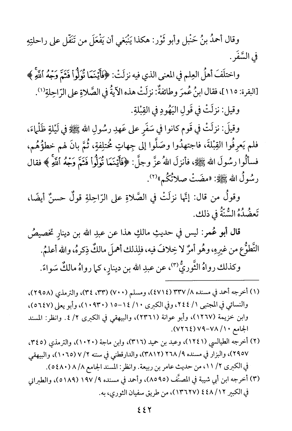 وقال أحمدُ بنُ حَنْبل وأبو ثَوْر: هكذا يَنْبَغي أن يَفْعَلَ من تَنَفّل على راحلتِهِ في السَّفَر.