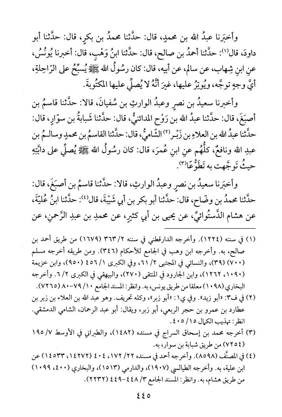 وأخبرنا سعيدُ بن نصرٍ وعبدُ الوارثِ بن سُفيانَ، قالا: حدَّثنا قاسمُ بن أصبَغَ، قال: حدَّثنا عبدُ اللَّه بن رَوْح المدائنيُّ، قال: حدَّثنا شَبابةُ بن سوّارٍ، قال: حدَّثنا عبدُ اللَّه بن العلاءِ بن زَبْر (¬٢) الشّاميُّ، قال: حدَّثنا القاسمُ بن محمدٍ وسالمُ بن عبدِ اللَّه ونافع، كلُّهُم عنِ ابنِ عُمرَ، قال: كان رسُولُ اللَّه -صلى اللَّه عليه وسلم- يُصلِّي على دابَّتِهِ حيثُ تَوجَّهت به تَطَوُّعًا (¬٣).