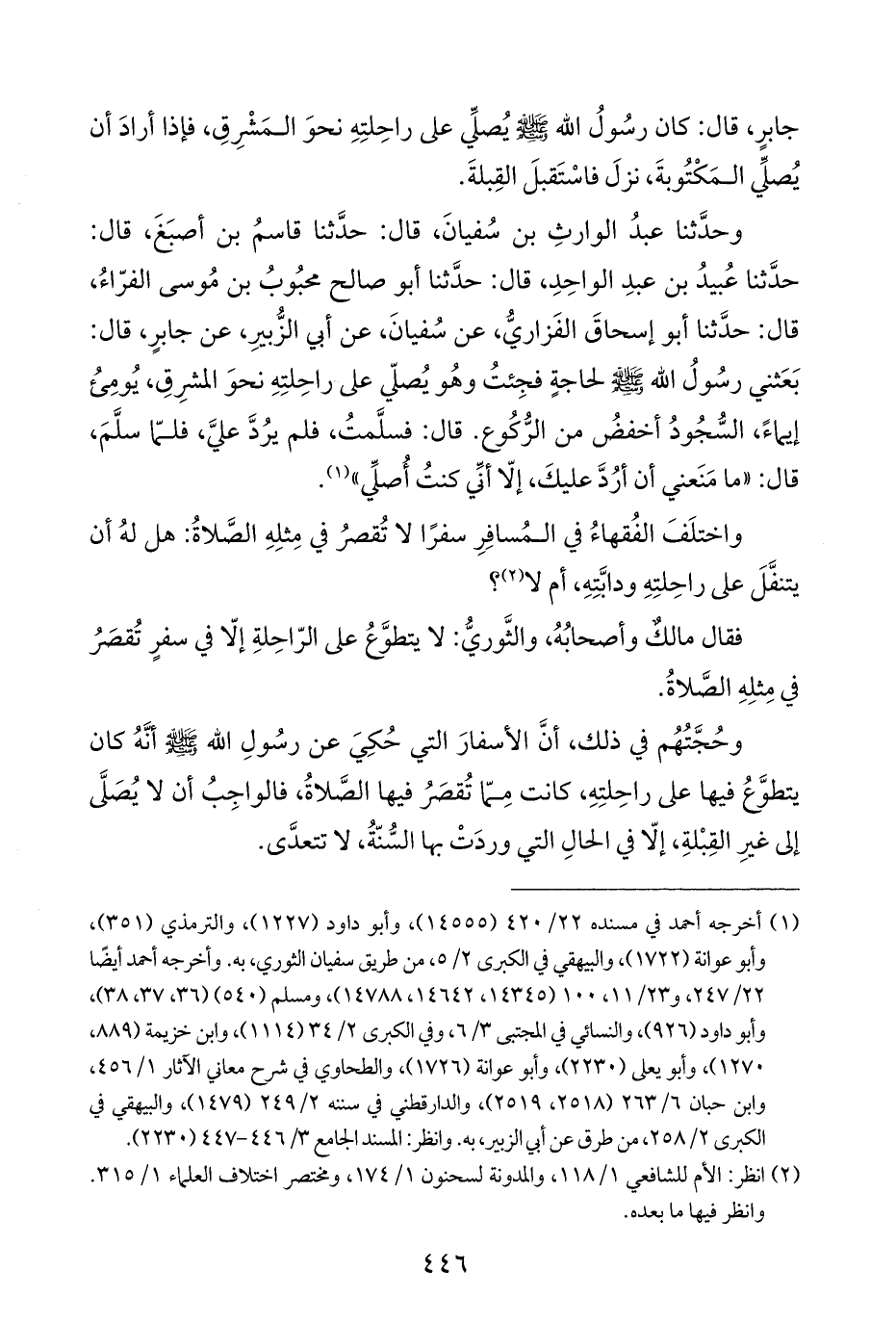 وحدَّثنا عبدُ الوارثِ بن سُفيانَ، قال: حدَّثنا قاسمُ بن أصبَغَ، قال: حدَّثنا عُبيدُ بن عبدِ الواحِدِ، قال: حدَّثنا أبو صالح محبُوبُ بن مُوسى الفرّاءُ، قال: حدَّثنا أبو إسحاقَ الفَزاريُّ، عن سُفيانَ، عن أبي الزُّبيرِ، عن جابرٍ، قال: بَعَثني رسُولُ اللَّه -صلى اللَّه عليه وسلم- لحاجةٍ فجِئتُ وهُو يُصلّي على راحِلتِهِ نحوَ المشرِقِ، يُومِئُ إيماءً، السُّجُودُ أخفضُ من الرُّكُوع. قال: فسلَّمتُ، فلم يرُدَّ عليَّ، فلمّا سلَّمَ، قال: "ما مَنَعني أن أرُدَّ عليكَ، إلّا أنِّي كنتُ أُصلِّي" (¬١).