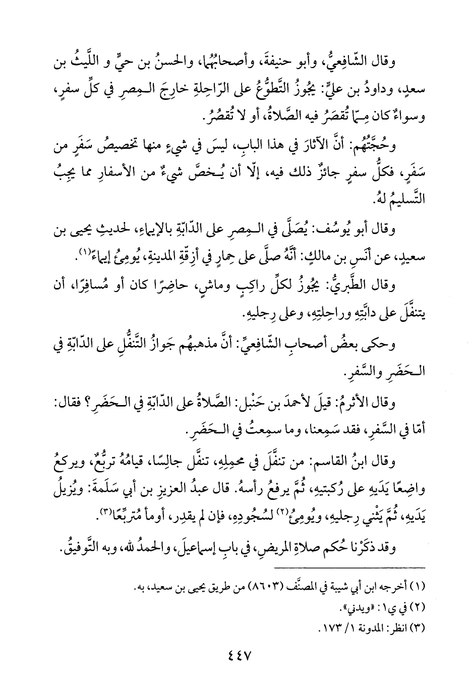 وقال الطَّبريُّ: يجُوزُ لكلِّ راكِبٍ وماشٍ، حاضِرًا كان أو مُسافِرًا، أن يتنفَّلَ على دابَّتِهِ وراحِلتِهِ، وعلى رِجليهِ.