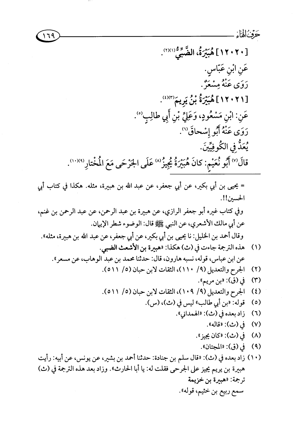 (¬١٠) زاد بعده في (ث): "قال سلم بن جنادة: حدثنا أحمد بن بشير، عن يونس، عن أبيه: رأيت هبيرة بن يريم يجيز على الجرحى فقلت له: يا أبا الحارث". وزاد بعد هذه الترجمة في (ث) ترجمة: "هبرة بن خزيمة