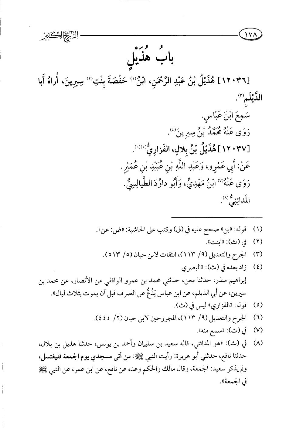 (¬٨) في (ث): "هو المدائني، قاله سعيد بن سليمان وأحمد بن يونس، حدثنا هذيل بن بلال، حدثنا نافع، حدثني أبو هريرة: رأيت النبي -صلى اللَّه عليه وسلم-: من أتى مسجدي يوم الجمعة فليغتسل، ولم يذكر سعيد: الجمعة، وقال مالك والحكم وعده عن نافع، عن ابن عمر، عن النبي -صلى اللَّه عليه وسلم- في الجمعة".