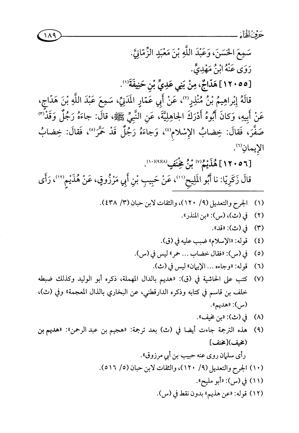 (¬٩) هذه الترجمة جاءت أيضا في (ث) بعد ترجمة: "هجيم بن عبد الرحمن": "هديم بن (مخيف) [مخنف]