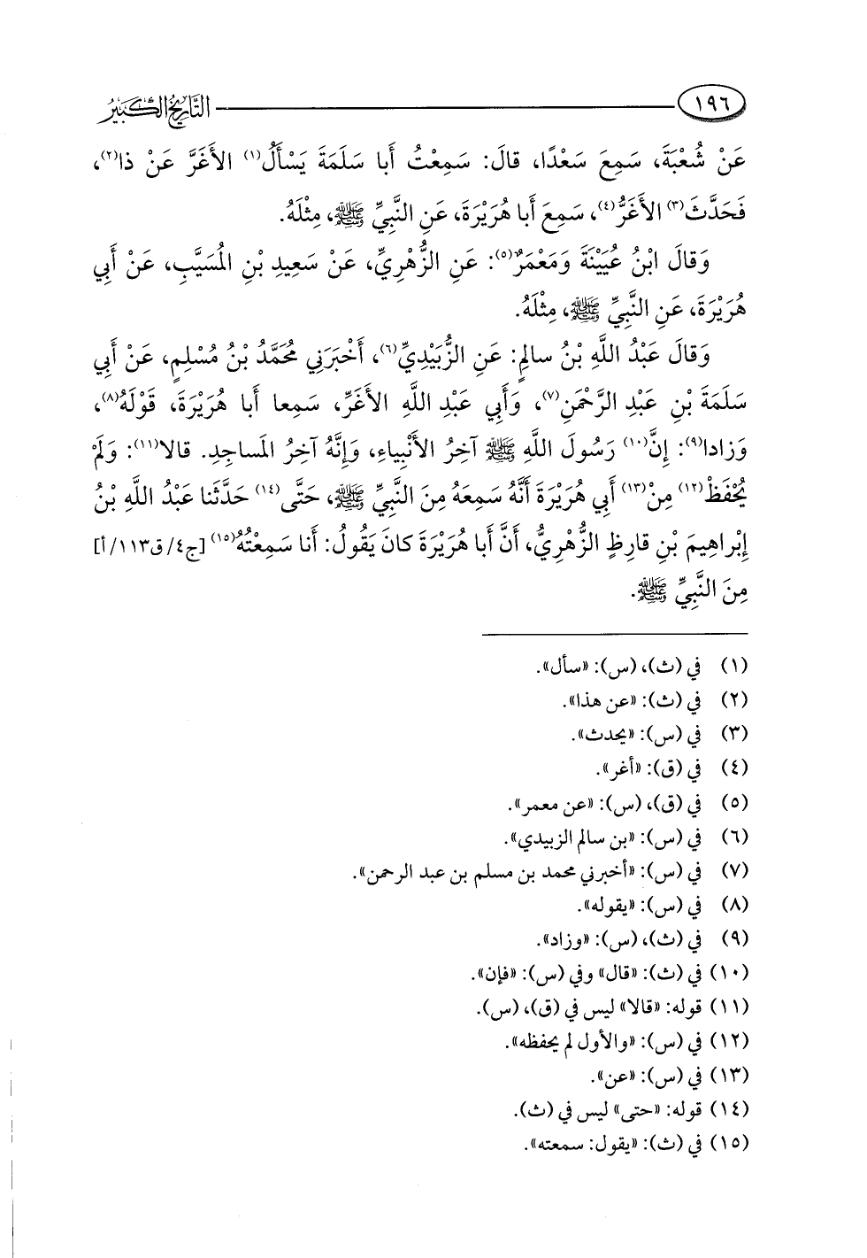 وَقالَ عَبْدُ اللَّهِ بْنُ سالِمٍ: عَنِ الزُّبَيْدِيِّ (¬٦)، أَخْبَرَنِي مُحَمَّدُ بْنُ مُسْلِمٍ، عَنْ أَبِي سَلَمَةَ بْنِ عَبْدِ الرَّحْمَنِ (¬٧)، وَأَبِي عَبْدِ اللَّهِ الأَغَرِّ، سَمِعا أَبَا هُرَيْرَةَ، قَوْلَهُ (¬٨)، وَزادا (¬٩): إِنَّ (¬١٠) رَسُولَ اللَّهِ -صلى اللَّه عليه وسلم- آخِر الأَنْبِياءِ، وَإِنَّهُ آخِرُ المَساجِدِ. قالا (¬١١): وَلَمْ يُحْفَظْ (¬١٢) مِنْ (¬١٣) أَبِي هُرَيْرَةَ أنَّهُ سَمِعَهُ مِنَ النَّبِيِّ -صلى اللَّه عليه وسلم-، حَتَّى (¬١٤) حَدَّثَنا عَبْدُ اللَّهِ بْنُ إِبْراهِيمَ بْنِ قارِظٍ الزُّهْرِيُّ، أَنَّ أَبَا هُرَيْرَةَ كانَ يَقُولُ: أَنا سَمِعْتُهُ (¬١٥) مِنَ النَّبِيِّ -صلى اللَّه عليه وسلم-.