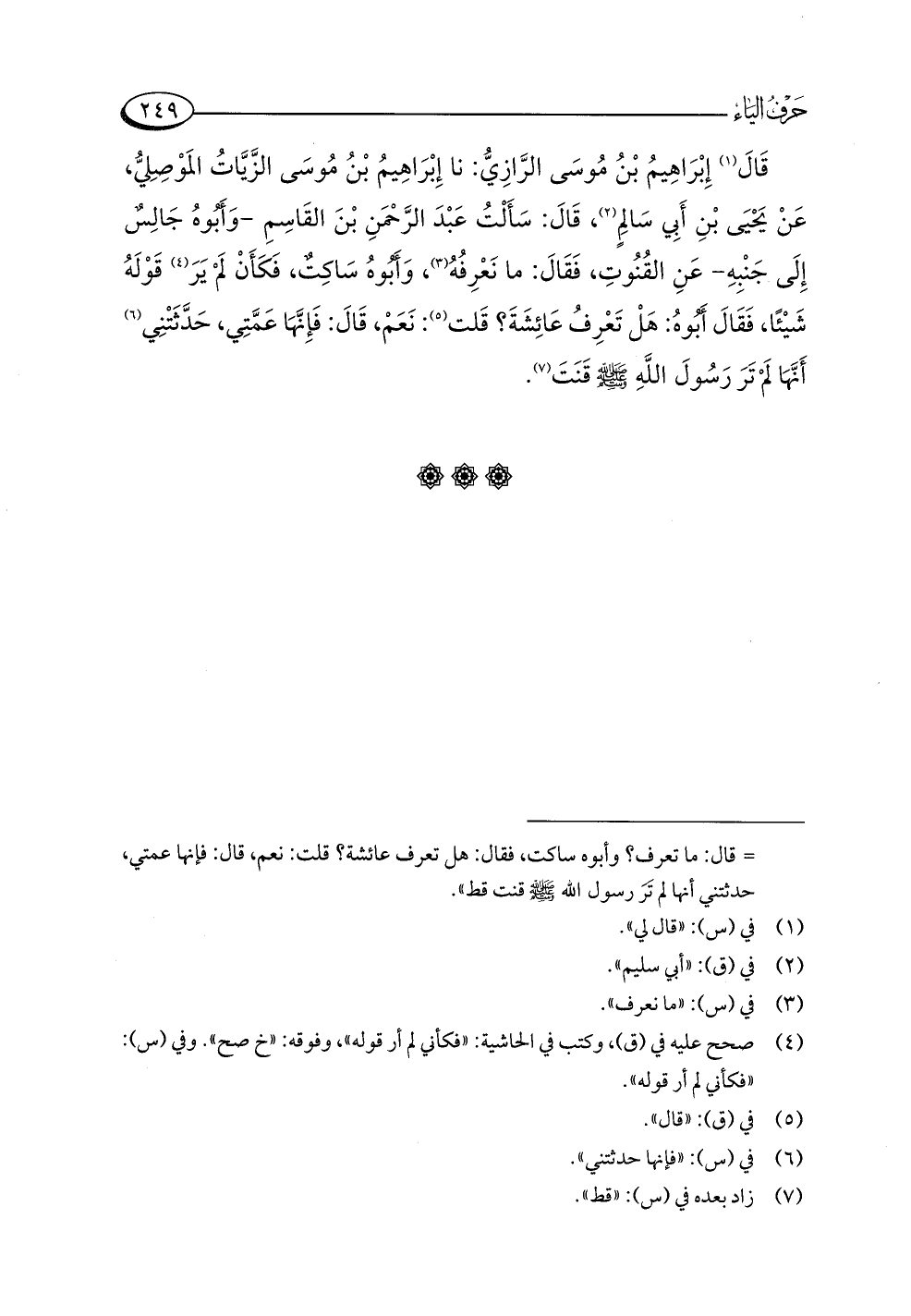 قَالَ (¬١) إِبْرَاهِيمُ بْنُ مُوسَى الرَّازِيُّ: نا إِبْرَاهِيمُ بْنُ مُوسَى الزَّيَّاتُ المَوْصِليُّ، عَنْ يَحْيَى بْنِ أَبِي سَالِمٍ (¬٢)، قَالَ: سَأَلْتُ عَبْدَ الرَّحْمَنِ بْنَ القَاسِمِ -وَأَبُوهُ جَالِسٌ إِلَى جَنْبِهِ- عَنِ القُنُوتِ، فَقَالَ: ما نَعْرِفُهُ (¬٣)، وَأَبُوهُ سَاكِتٌ، فَكَأَنْ لَمْ يَرَ (¬٤) قَوْلَهُ شَيْئًا، فَقَالَ أَبُوهُ: هَلْ تَعْرِفُ عَائِشَةَ؟ قَلت (¬٥): نَعَمْ، قَالَ: فَإِنَّهَا عَمَّتِي، حَدَّثَتْنِي (¬٦) أَنَّهَا لَمْ تَرَ رَسُولَ اللَّهِ -صلى اللَّه عليه وسلم- قَنَتَ (¬٧).