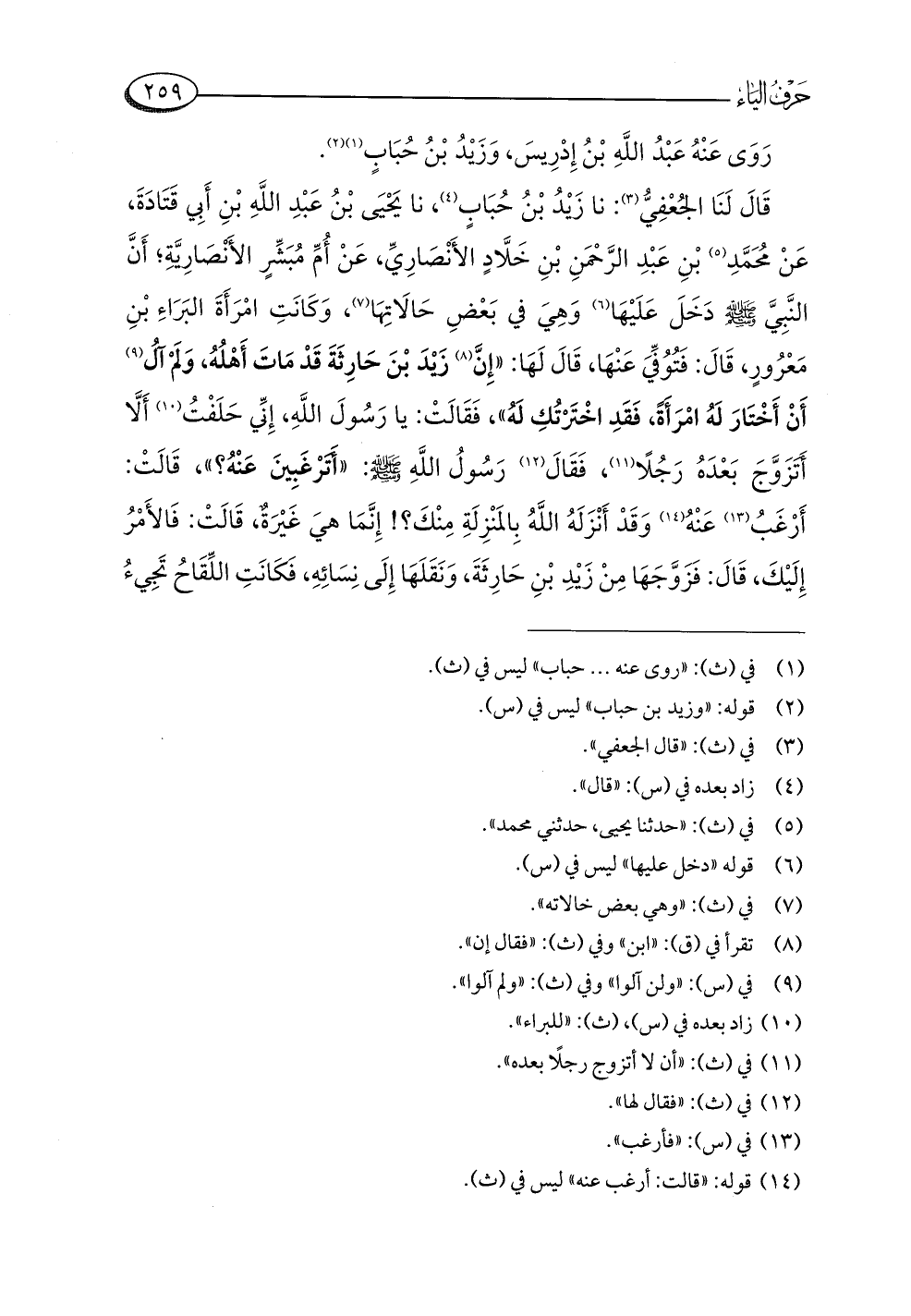 قَالَ لَنَا الجُعْفِيُّ (¬٣): نا زَيْدُ بْنُ حُبَابٍ (¬٤)، نا يَحْيَى بْنُ عَبْدِ اللَّهِ بْنِ أَبِي قَتَادَةَ، عَنْ مُحَمَّدِ (¬٥) بْنِ عَبْدِ الرَّحْمَنِ بْنِ خَلَّادٍ الأَنْصَارِيِّ، عَنْ أُمِّ مُبَشِّرٍ الأَنْصَارِيَّةِ؛ أَنَّ النَّبِيَّ -صلى اللَّه عليه وسلم- دخَلَ عَلَيْهَا (¬٦) وَهِيَ في بَعْضِ حَالاتِهَا (¬٧)، وَكَانَتِ امْرَأَةَ البَرَاءِ بْنِ مَعْرُورٍ، قَالَ: فَتُوُفِّيَ عَنْهَا، قَالَ لَهَا: "إِنَّ (¬٨) زَيْدَ بْنَ حَارِثَةَ قَدْ مَاتَ أَهْلُهُ، وَلَمْ آلُ (¬٩) أَنْ أَخْتَارَ لَهُ امْرَأَةً، فَقَدِ اخْتَرْتُكِ لَهُ"، فَقَالَتْ: يا رَسُولَ اللَّهِ، إِنِّي حَلَفْتُ (¬١٠) أَلَّا أَتزَوَّجَ بَعْدَهُ رَجُلًا (¬١١)، فَقَالَ (¬١٢) رَسُولُ اللَّهِ -صلى اللَّه عليه وسلم-: "أَتَرْغَبِينَ عَنْهُ؟ "، قَالَتْ: أَرْغَبُ (¬١٣) عَنْهُ (¬١٤) وَقَدْ أَنْزَلَهُ اللَّهُ بِالمَنْزِلَةِ مِنْكَ؟ ! إِنَّمَا هيَ غَيْرَةٌ، قَالَتْ: فَالأَمْرُ إِلَيْكَ، قَالَ: فَزَوَّجَهَا مِنْ زَيْدِ بْنِ حَارِثَةَ، وَنَقَلَهَا إِلَى نِسَائِهِ، فَكَانَتِ اللِّقَاحُ تَجِيءُ