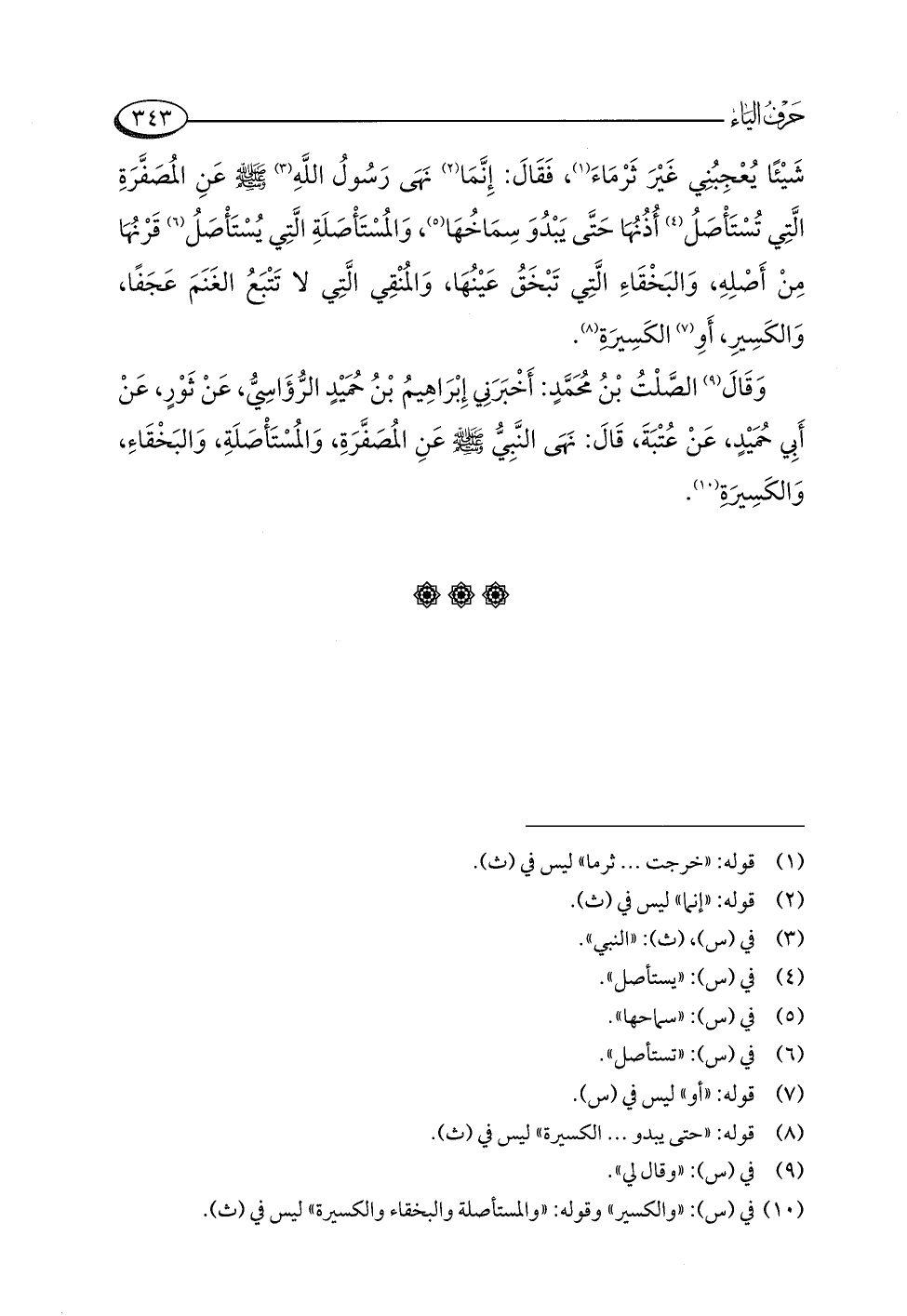 وَقَالَ (¬٩) الصَّلْتُ بْنُ مُحَمَّدٍ: أَخْبَرَنِي إِبْرَاهِيمُ بْنُ حُمَيْدٍ الرُّؤَاسِيُّ، عَنْ ثَوْرٍ، عَنْ أبي حُمَيْدٍ، عَنْ عُتْبَةَ، قَالَ: نَهَى النَّبِيُّ -صلى اللَّه عليه وسلم- عنِ المُصَفَّرَةِ، وَالمُسْتَأْصَلَةِ، وَالبَخْقَاءِ، وَالكَسِيرَةِ (¬١٠).