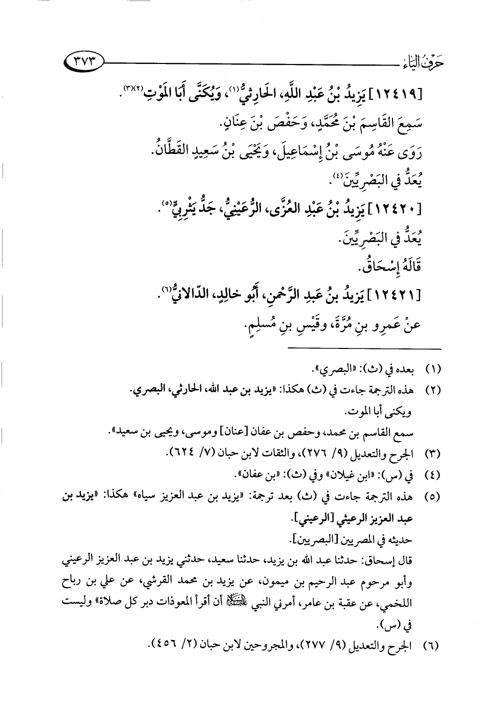(¬٢) هذه الترجمة جاءت في (ث) هكذا: "يزيد بن عبد اللَّه، الحارثي، البصري.