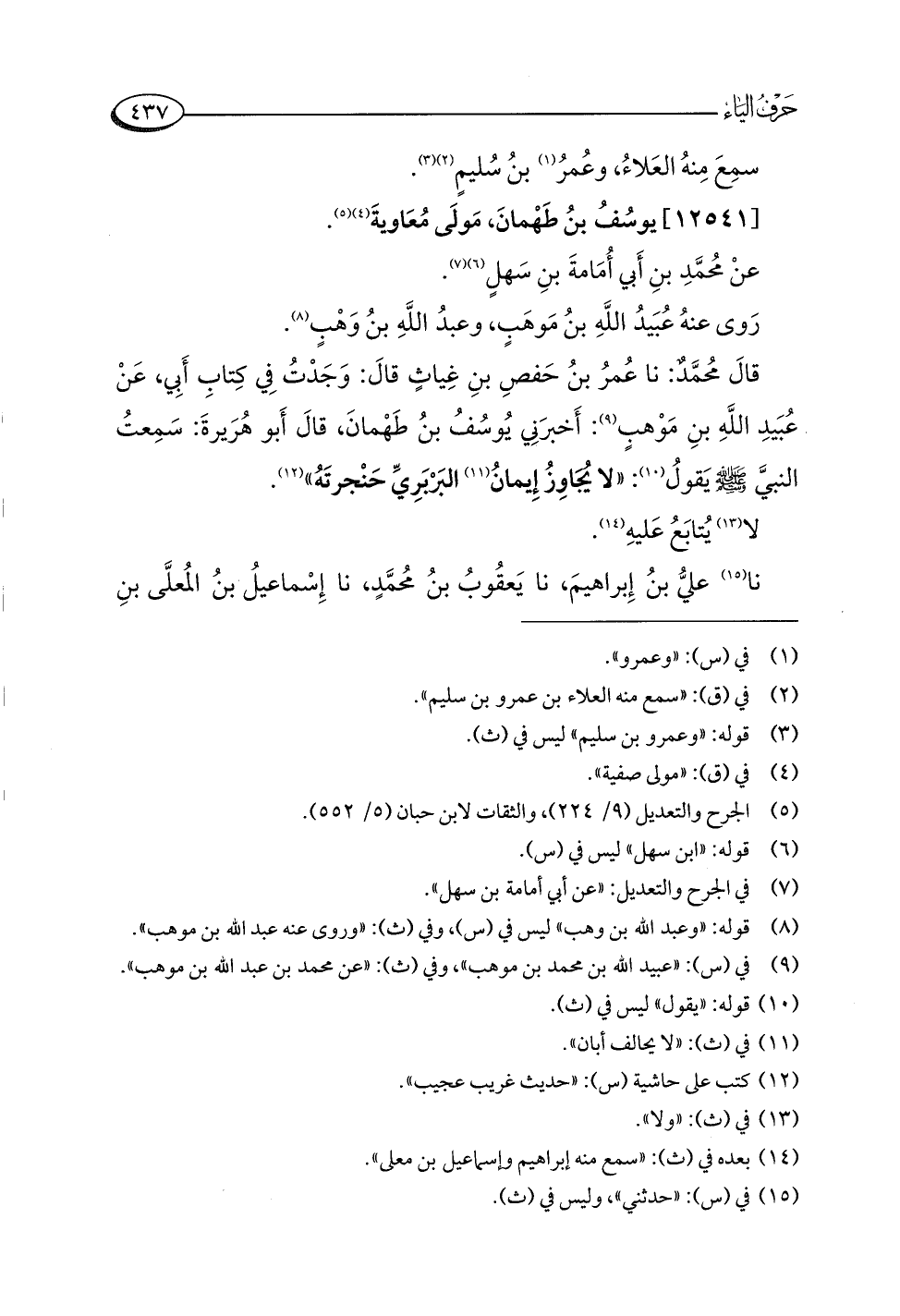قالَ مُحمَّد: نا عُمرُ بنُ حَفصِ بنِ غِياثٍ قالَ: وَجَدْتُ في كِتابِ أَبِي، عَنْ عُبَيدِ اللَّهِ بنِ مَوْهبٍ (¬٩): أَخبرَنِي يُوسُفُ بنُ طَهْمانَ، قالَ أَبُو هُرَيرةَ: سَمِعتُ النبيَّ -صلى اللَّه عليه وسلم- يَقولُ (¬١٠): "لا يُجَاوِزُ إِيمانُ (¬١١) البَرْبَرِيِّ حَنْجرتَهُ" (¬١٢).