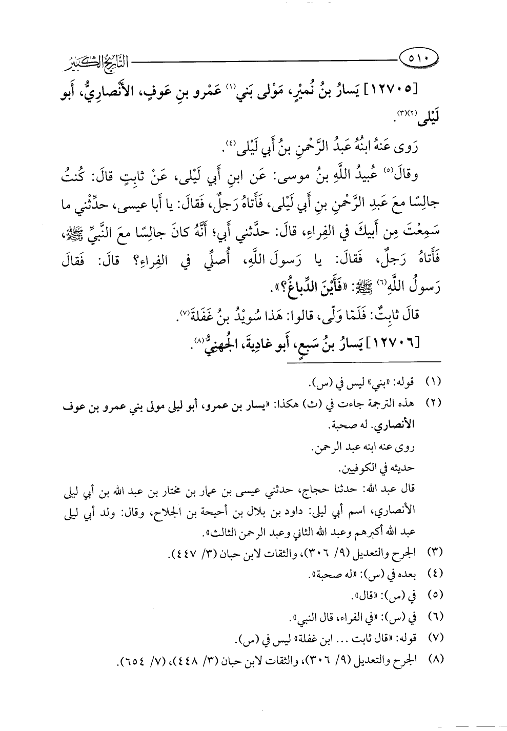(¬٢) هذه الترجمة جاءت في (ث) هكذا: "يسار بن عمرو، أبو ليلى مولى بني عمرو بن عوف الأنصاري. له صحبة.