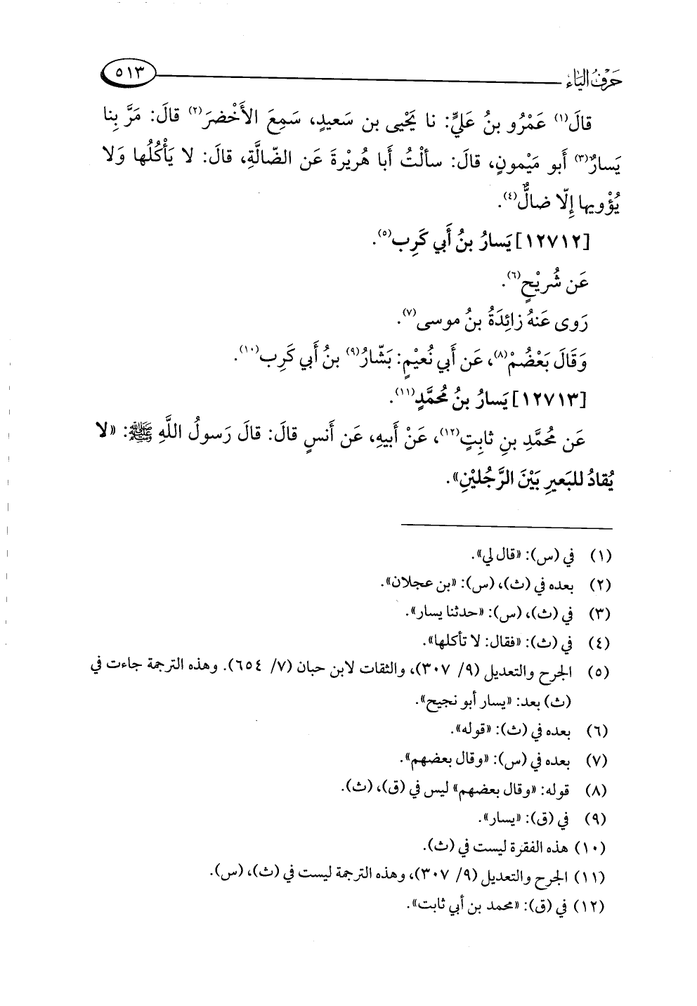 عَن مُحمَّدِ بنِ ثابِتٍ (¬١٢)، عَنْ أَبيهِ، عَن أَنَسٍ قالَ: قالَ رَسولُ اللَّهِ -صلى اللَّه عليه وسلم-: "لا يُقادُ للبَعيرِ بَيْنَ الرَّجُليْنِ".