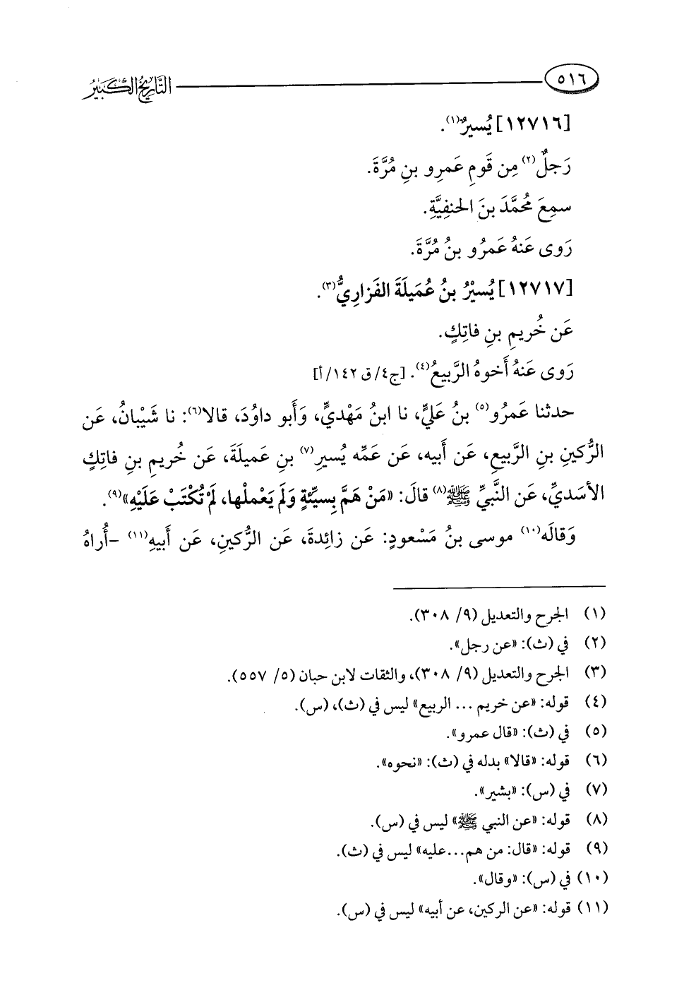 حدثنا عَمرُو (¬٥) بنُ عَلِيٍّ، نا ابنُ مَهْديٍّ، وَأَبو داوُدَ، قالا (¬٦): نا شَيْبانُ، عَن الرُّكينِ بنِ الرَّبيعِ، عَن أَبيه، عَن عَمِّه يُسيرِ (¬٧) بنِ عَميلَةَ، عَن خُريمِ بنِ فاتِكٍ الأسَديِّ، عَن النَّبيِّ -صلى اللَّه عليه وسلم- (¬٨) قالَ: "مَنْ هَمَّ بِسيِّئةٍ وَلَم يَعْملْها, لَمْ تُكْتَبْ عَلَيْهِ" (¬٩).