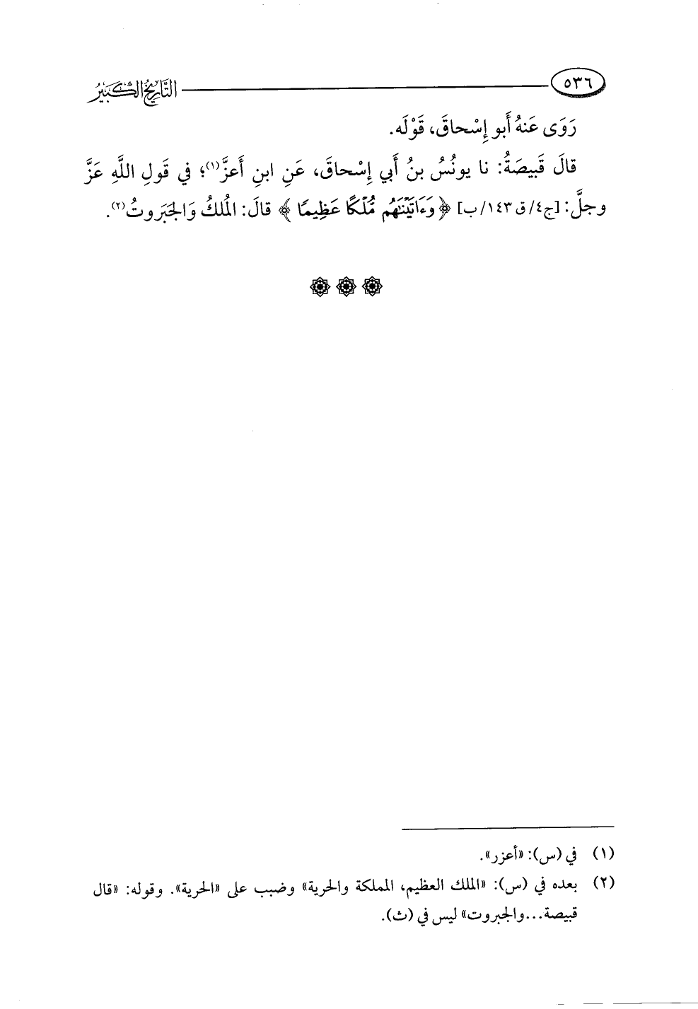 قالَ قَبيصَةُ: نا يونُسُ بنُ أَبي إِسْحاقَ، عَنِ ابنِ أَعزَّ (¬١)، في قَولِ اللَّهِ عَزَّ وجلَّ: {وَآتَيْنَاهُمْ مُلْكًا عَظِيمًا} قالَ: المُلكُ وَالجَبَروتُ (¬٢).