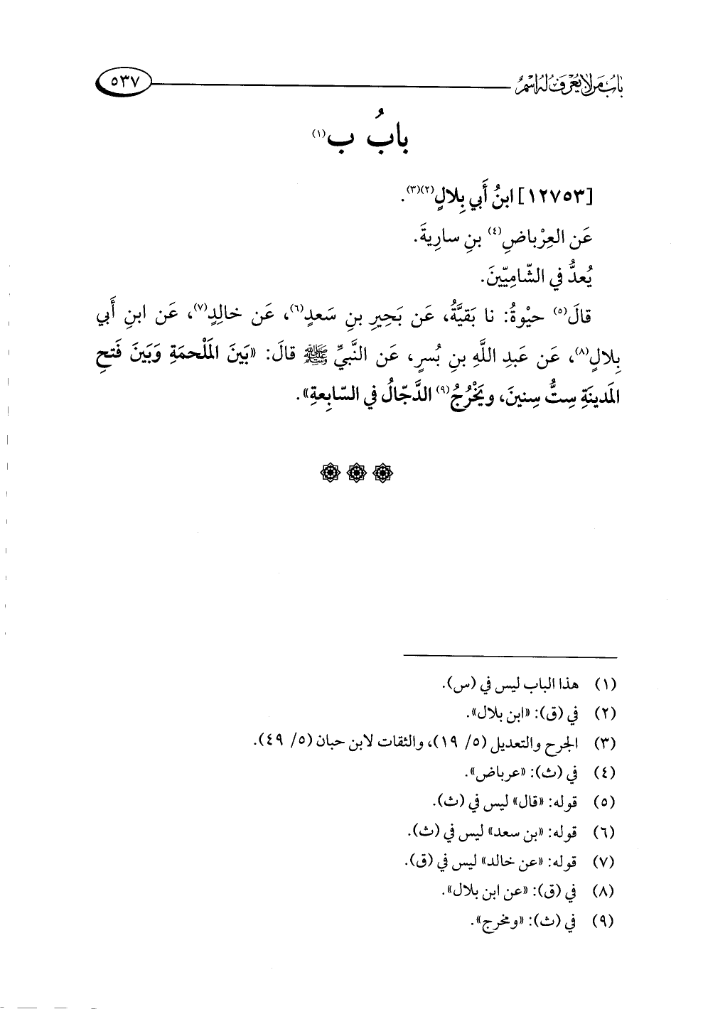 قالَ (¬٥) حيْوةُ: نا بَقيَّةُ، عَن بَحِيرِ بنِ سَعدٍ (¬٦)، عَن خالِدٍ (¬٧)، عَن ابنِ أَبي بِلالٍ (¬٨)، عَن عَبدِ اللَّهِ بنِ بُسرٍ، عَن النَّبيِّ -صلى اللَّه عليه وسلم- قالَ: "بَينَ المَلْحمَةِ وَبَينَ فَتحِ المَدينةِ سِتُّ سِنينَ، ويَخْرُجُ (¬٩) الدَّجّالُ في السّابِعةِ".