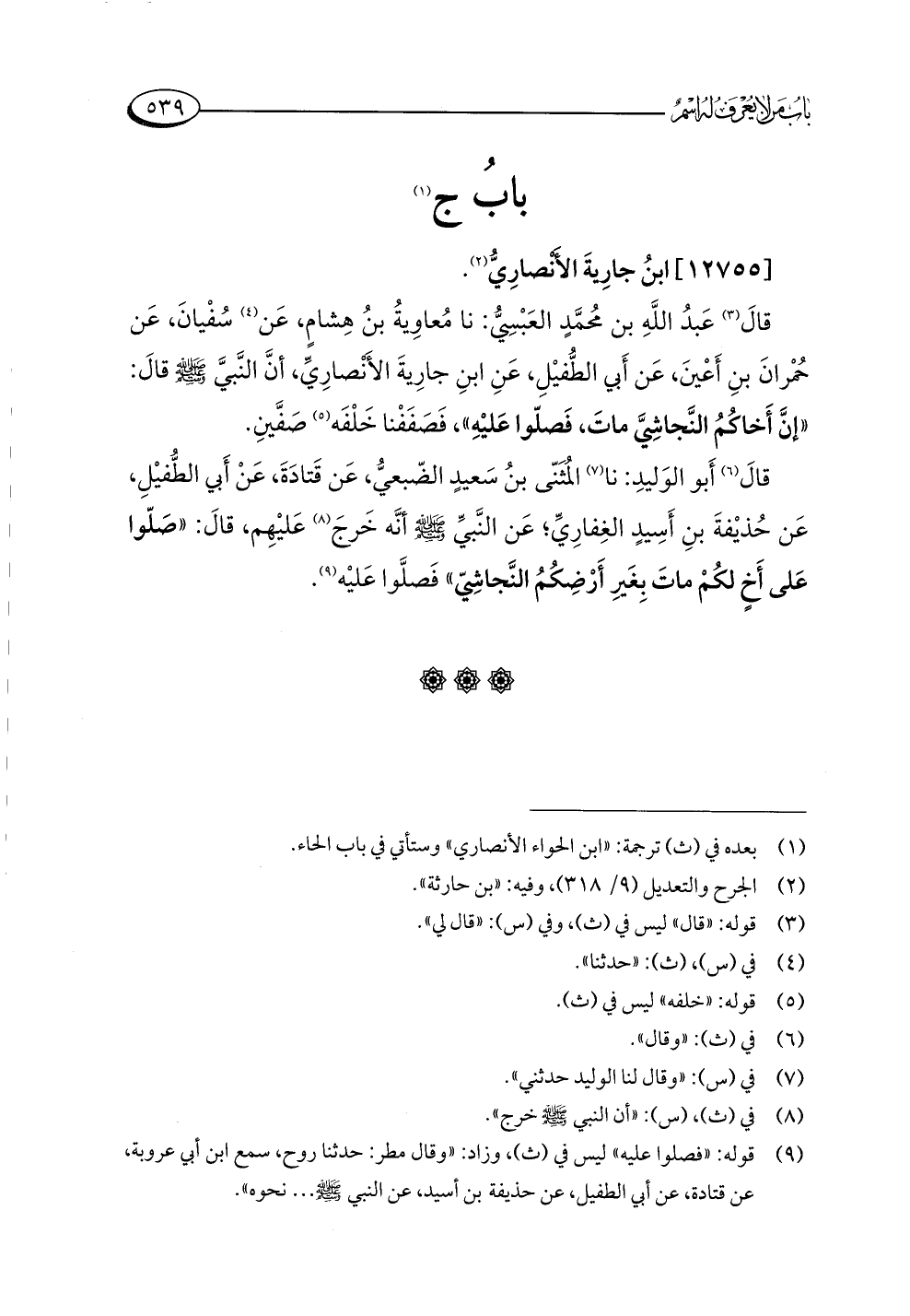 قالَ (¬٣) عَبدُ اللَّهِ بن مُحمَّدٍ العَبْسِيُّ: نا مُعاوِيةُ بنُ هِشامٍ، عَن (¬٤) سُفْيانَ، عَن حُمْرانَ بنِ أَعْينَ، عَن أَبي الطُّفيْلِ، عَنِ ابنِ جارِيةَ الأَنْصارِيِّ، أنَّ النَّبيَّ -صلى اللَّه عليه وسلم- قالَ: "إنَّ أَخاكُمُ النَّجاشِيَّ ماتَ، فَصلّوا عَليْهِ"، فَصَفَفْنا خَلْفَه (¬٥) صَفَّينِ.