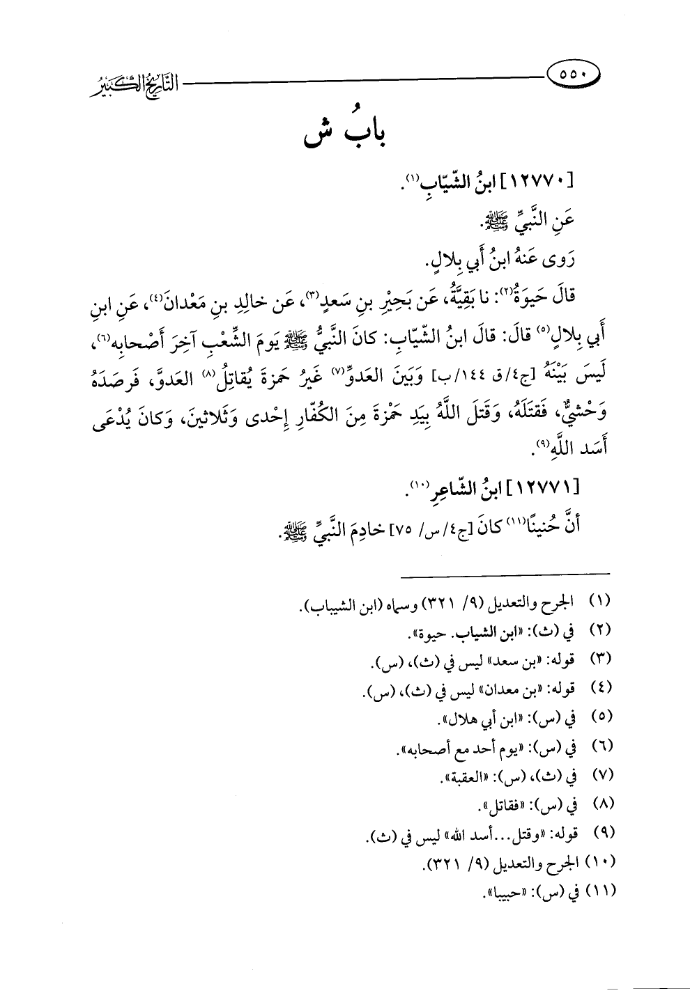 قالَ حَيوَةُ (¬٢): نا بَقِيَّةُ، عَن بَحِيْرِ بنِ سَعدٍ (¬٣)، عَن خالِدِ بنِ مَعْدانَ (¬٤)، عَنِ ابنِ أَبي بِلالٍ (¬٥) قالَ: قالَ ابنُ الشّيّابِ: كانَ النَّبيُّ -صلى اللَّه عليه وسلم- يَومَ الشِّعْبِ آخِرَ أَصْحابِه (¬٦)، لَيسَ بَيْنَهُ وَبَينَ العَدوِّ (¬٧) غَيرُ حَمزةَ يُقاتِلُ (¬٨) العَدوَّ، فَرصَدَهُ وَحْشيٌّ، فَقتَلَهُ، وَقَتلَ اللَّه بِيَدِ حَمْزةَ مِنَ الكُفّارِ إِحْدى وَثَلاثينَ، وَكانَ يُدْعَى أَسَد اللَّهِ (¬٩).