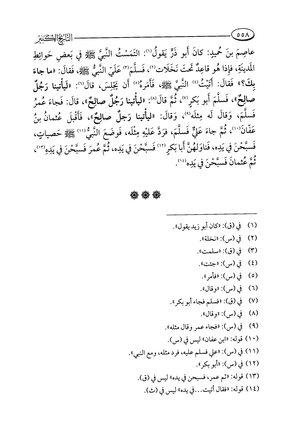 عاصِمَ بنَ حُميدٍ: كانَ أَبُو ذَرٍّ يَقولُ (¬١): التَمَسْتُ النَّبيَّ -صلى اللَّه عليه وسلم- في بَعضِ حَوائِطِ المَدينَةِ، فإِذا هُو قاعِدٌ تَحتَ نَخَلَات (¬٢)، فَسلَّمَ (¬٣) عَلَيّ النَّبيُّ -صلى اللَّه عليه وسلم- فَقالَ: "ما جاءَ بِكَ؟ " فَقالَ: أَتَيْتُ (¬٤) النَّبيَّ -صلى اللَّه عليه وسلم-، فَأَمَرهُ (¬٥) أَن يَجْلِسَ، قالَ (¬٦): "لَيأْتينا رَجُلٌ صالِحٌ"، فَسلَّمَ أَبُو بَكرٍ (¬٧)، ثُمَّ قالَ (¬٨): "ليأْتينا رَجُلٌ صالِحٌ"، قالَ: فَجاءَ عُمرُ فَسلَّمَ، وَقالَ لَه مِثلَه (¬٩)، وَقالَ: "ليأْتينا رَجلٌ صالِحٌ"، فَأَقْبلَ عُثمانُ بنُ عَفّانَ (¬١٠)، ثُمَّ جاءَ عَليٌّ فَسلَّمَ، فرَدَّ عَليْهِ مِثْلَه، فَوضَعَ النَّبيُّ (¬١١) -صلى اللَّه عليه وسلم- حَصياتٍ، فَسبَّحْنَ في يَدِه، فَناوَلهُنَّ أَبَا بَكرٍ (¬١٢) فَسبَّحْنَ في يَدِه، ثُمَّ عُمرَ فَسبَّحْنَ في يَدِهِ (¬١٣)، ثُمَّ عُثمانَ فَسبَّحْنَ في يَدِه (¬١٤).