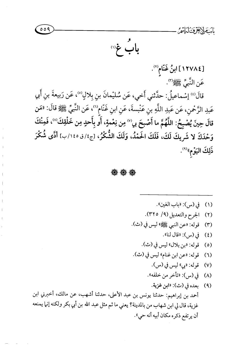 قالَ (¬٤) إسْماعيلُ: حَدَّثَنِي أَخي، عَن سُليْمانَ بنِ بِلالٍ (¬٥)، عَن رَبيعةَ بنِ أَبي عَبدِ الرَّحْمنِ، عَن عَبدِ اللَّهِ بنِ عَنْبسةَ، عَنِ ابنِ غَنّامٍ (¬٦)، عَن النَّبيِّ -صلى اللَّه عليه وسلم- قالَ: "مَن قالَ حِينَ يُصْبِحُ: اللَّهُمَّ ما أَصْبحَ بي (¬٧) مِن نِعْمةٍ، أَو بِأَحدٍ مِن خَلْقِكَ (¬٨)، فَمِنْكَ وَحْدَكَ لا شَريكَ لَكَ، فَلَكَ الحَمْدُ، وَلَكَ الشُّكْرُ، أدَّى شُكْرَ ذَلِكَ اليَوْمِ" (¬٩).