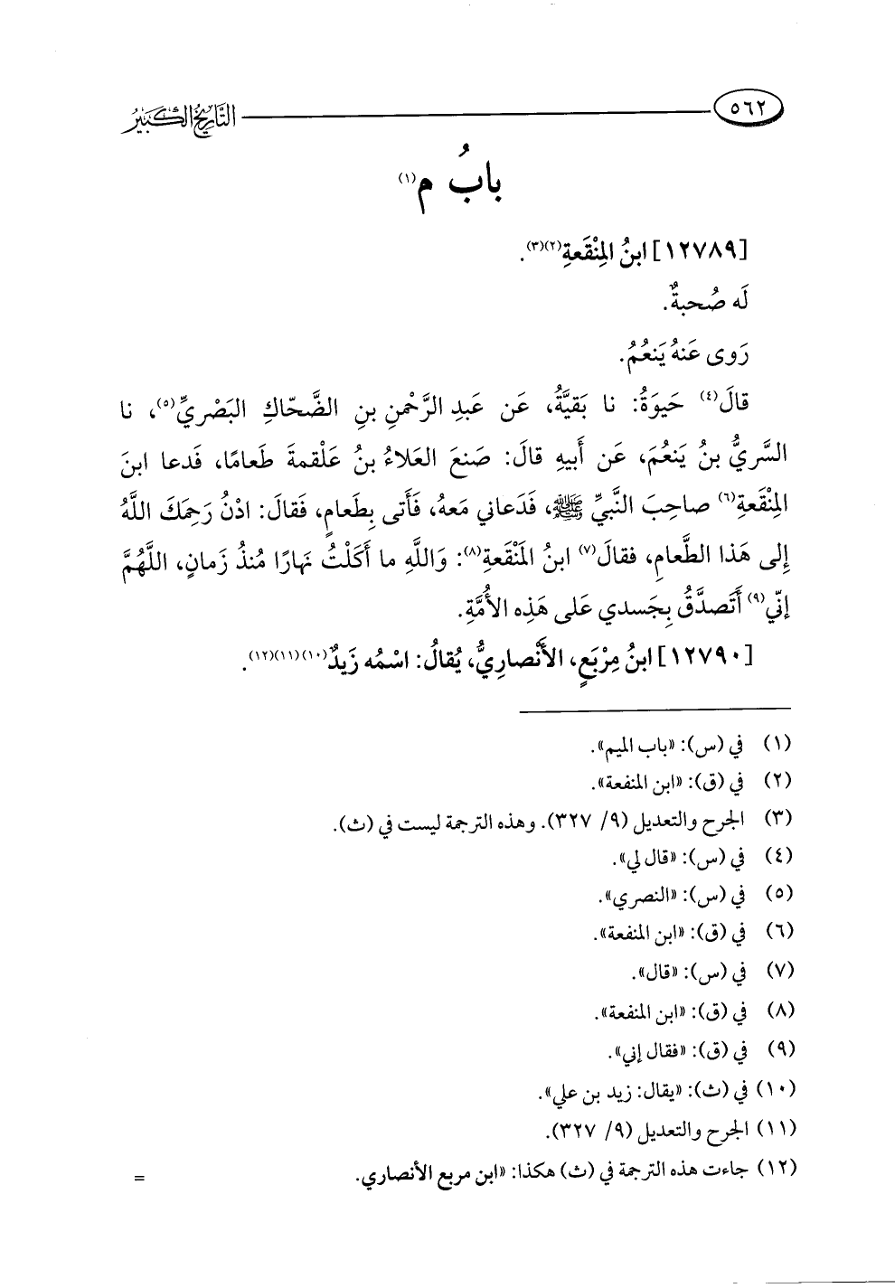 (¬١٢) جاءت هذه الترجمة في (ث) هكذا: "ابن مربع الأنصاري. =