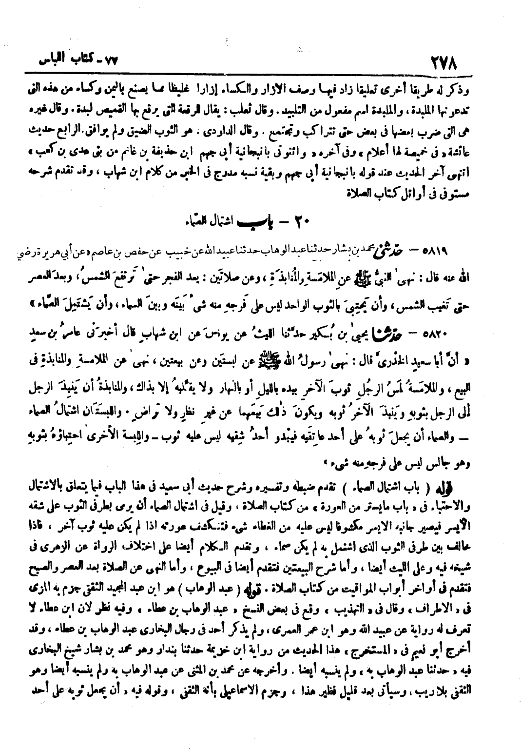 تَقَدَّمَ ضَبْطُهُ وَتَفْسِيرُهُ وَشَرْحُ حَدِيثِ أَبِي سَعِيدٍ فِي هَذَا الْبَابِ فِيمَا يَتَعَلَّقُ بِالِاشْتِمَالِ وَالِاحْتِبَاءِ فِي بَابِ مَا يُسْتَرُ مِنَ الْعَوْرَةِ مِنْ كِتَابِ الصَّلَاةِ وَقِيلَ فِي اشْتِمَالِ الصَّمَّاءِ أَنْ يَرْمِيَ بِطَرَفَيِ الثَّوْبِ عَلَى شِقِّهِ الْأَيْسَرِ فَيَصِيرُ جَانِبُهُ الْأَيْسَرُ مَكْشُوفًا لَيْسَ عَلَيْهِ مِنَ الْغِطَاءِ شَيْءٌ فَتَنْكَشِفَ عَوْرَتُهُ إِذَا لَمْ يَكُنْ عَلَيْهِ ثَوْبٌ آخَرُ فَإِذَا خَالَفَ بَيْنَ طَرَفَيِ الثَّوْبِ الَّذِي اشْتَمَلَ بِهِ لَمْ يَكُنْ صَمَّاءَ وَتَقَدَّمَ الْكَلَامُ أَيْضًا عَلَى اخْتِلَافِ الرُّوَاةِ عَنِ الزُّهْرِيِّ فِي شَيْخِهِ فِيهِ وَعَلَى اللَّيْثِ أَيْضًا وَأَمَّا شَرْحُ الْبَيْعَتَيْنِ فَتَقَدَّمَ أَيْضًا فِي الْبُيُوعِ وَأَمَّا النَّهْيُ عَنْ الصَّلَاةِ بَعْدَ الْعَصْرِ وَالصُّبْحِ فَتَقَدَّمَ فِي أَوَاخِرِ أَبْوَابِ الْمَوَاقِيتِ مِنْ كِتَابِ الصَّلَاةِ