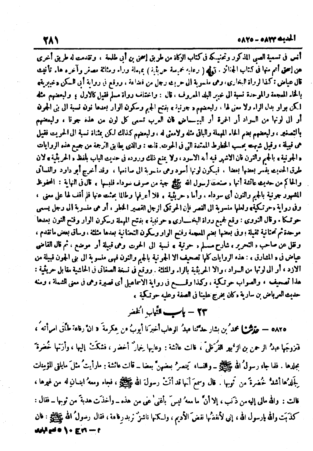 أَنَسٍ فِي تَسْمِيَةِ الصَّبِيِّ الْمَذْكُورِ وَتَحْنِيكِهِ فِي كِتَابِ الزَّكَاةِ مِنْ طَرِيقِ إِسْحَاقَ بْنِ أَبِي طَلْحَةَ وَتَقَدَّمَتْ لَهُ طَرِيقٌ أُخْرَى عَنْ إِسْحَاقَ أَتَمَّ مِنْهَا فِي كِتَابِ الْجَنَائِزِ قَوْلُهُ وَعَلَيْهِ خميصة حريثية بِمُهْملَة وَرَاء ومثلثة مصغر وَآخِرُهُ هَاءُ تَأْنِيثٍ قَالَ عِيَاضٌ كَذَا لِرُوَاةِ الْبُخَارِيِّ وَهِيَ مَنْسُوبَةٌ إِلَى حُرَيْثٍ رَجُلٍ مِنْ قُضَاعَةَ وَوَقَعَ فِي رِوَايَةِ أَبِي السَّكَنِ خَيْبَرِيَّةٌ بِالْخَاءِ الْمُعْجَمَةِ وَالْمُوَحَّدَةِ نِسْبَةً إِلَى خَيْبَرَ الْبَلَدِ الْمَعْرُوفِ قَالَ وَاخْتَلَفَ رُوَاةُ مُسْلِمٍ فَقِيلَ كَالْأَوَّلِ وَلِبَعْضِهِمْ مِثْلَهُ لَكِنْ بِوَاوٍ بَدَلَ الرَّاءِ وَلَا مَعْنَى لَهَا وَلِبَعْضِهِمْ جَوْنِيَّةٌ بِفَتْحِ الْجِيمِ وَسُكُونِ الْوَاوِ بَعْدَهَا نُونٌ نِسْبَةً إِلَى بَنِي الْجَوْنِ أَوْ إِلَى لَوْنِهَا مِنَ السَّوَادِ أَوِ الْحُمْرَةِ أَوِ الْبَيَاضِ فَإِنَّ الْعَرَبَ تُسَمِّي كُلَّ لَوْنٍ مِنْ هَذِهِ جَوْنًا وَلِبَعْضِهِمْ بِالتَّصْغِيرِ وَلِبَعْضِهِمْ بِضَمِّ الْحَاءِ الْمُهْمَلَةِ وَالْبَاقِي مِثْلَهُ وَلَا مَعْنَى لَهُ وَلِبَعْضِهِمْ كَذَلِكَ لَكِنْ بِمُثَنَّاةٍ نِسْبَةً إِلَى الْحُوَيْتِ فَقِيلَ هِيَ قَبِيلَةٌ وَقِيلَ شُبِّهَتْ بِحَسَبِ الْخُطُوطِ الْمُمْتَدَّةِ الَّتِي فِي الْحُوتِ قُلْتُ وَالَّذِي يُطَابِقُ التَّرْجَمَةَ مِنْ جَمِيعِ هَذِهِ الرِّوَايَاتِ الْجَوْنِيَّةُ بِالْجِيمِ وَالنُّونِ فَإِنَّ الْأَشْهَرَ فِيهِ أَنَّهُ الْأَسْوَدُ وَلَا يَمْنَعُ ذَلِكَ وُرُودُهُ فِي حَدِيثِ الْبَابِ بِلَفْظِ الْحُرَيْثِيَّةِ لِأَنَّ طُرُقَ الْحَدِيثِ يُفَسِّرُ بَعْضُهَا بَعْضًا فَيَكُونُ لَوْنُهَا أَسْوَدَ وَهِيَ مَنْسُوبَةٌ إِلَى صَانِعِهَا وَقَدْ أَخْرَجَ أَبُو دَاوُدَ وَالنَّسَائِيُّ وَالْحَاكِمُ مِنْ حَدِيثِ عَائِشَةَ أَنَّهَا صَنَعَتْ لِرَسُولِ اللَّهِ صَلَّى اللَّهُ عَلَيْهِ وَسَلَّمَ جُبَّةً مِنْ صُوفٍ سَوْدَاءَ فَلَبِسَهَا قَالَ فِي النِّهَايَةِ الْمَحْفُوظُ الْمَشْهُورُ جَوْنِيَّةٌ بِالْجِيمِ وَالنُّونِ أَيْ سَوْدَاءُ وَأَمَّا حُرَيْثِيَّةٌ فَلَا أَعْرِفُهَا وَطَالَمَا بَحَثْتُ عَنْهَا فَلَمْ أَقِفْ لَهَا عَلَى مَعْنًى وَفِي رِوَايَةِ حَوْتَكِيَّةٌ وَلَعَلَّهَا مَنْسُوبَةٌ إِلَى الْقَصْرِ فَإِنَّ الْحَوْتَكِيَّ الرَّجُلُ الْقَصِيرُ الْخَطْوِ أَوْ هِيَ مَنْسُوبَةٌ إِلَى رَجُلٍ يُسَمَّى حَوْتَكًا وَقَالَ النَّوَوِيُّ وَقَعَ لِجَمِيعِ رُوَاةِ الْبُخَارِيِّ حَوْنَبِيَّةٌ بِفَتْحِ الْمُهْمَلَةِ وَسُكُونِ الْوَاوِ وَفَتْحِ النُّونِ بَعْدَهَا مُوَحَّدَةٌ ثُمَّ تَحْتَانِيَّةٌ ثَقِيلَةٌ وَفِي بَعْضِهَا بِضَمِّ الْمُعْجَمَةِ وَفَتْحِ الْوَاوِ وَسُكُونِ التَّحْتَانِيَّةِ بَعْدَهَا مُثَلَّثَةٌ وَسَاقَ بَعْضَ مَا تَقَدَّمَ وَنُقِلَ عَنْ صَاحِبِ التَّحْرِيرِ شَارِحِ مُسْلِمٍ حَوْتِيَّةٌ نِسْبَةً إِلَى الْحُوتِ وَهِيَ قَبِيلَةٌ أَوْ مَوْضِعٌ ثُمَّ قَالَ الْقَاضِي عِيَاضٌ فِي الْمَشَارِقِ هَذِهِ الرِّوَايَاتُ كُلُّهَا تَصْحِيفٌ إِلَّا الْجَوْنِيَّةَ بِالْجِيمِ وَالنُّونِ فَهِيَ مَنْسُوبَةٌ إِلَى بَنِي الْجَوْنِ قَبِيلَةٍ مِنَ الْأَزْدِ أَوْ إِلَى لَوْنِهَا مِنَ السَّوَادِ وَإِلَّا الْحُرَيْثِيَّةَ بِالرَّاءِ وَالْمُثَلَّثَةِ وَوَقَعَ فِي نُسْخَةِ الصَّغَانِيِّ فِي الْحَاشِيَةِ مُقَابِلَ حُرَيْثِيَّةٍ هَذَا تَصْحِيفٌ وَالصَّوَابُ حَوْتَكِيَّةٌ وَكَذَا وَقَعَ فِي رِوَايَةِ الْإِسْمَاعِيلِيِّ أَيْ قَصِيرَةٌ وَهِيَ فِي مَعْنَى الشَّمْلَةِ وَمِنْهُ حَدِيثُ الْعِرْبَاضِ بْنِ سَارِيَةَ كَانَ يَخْرُجُ عَلَيْنَا فِي الصُّفَّةِ وَعَلَيْهِ حَ