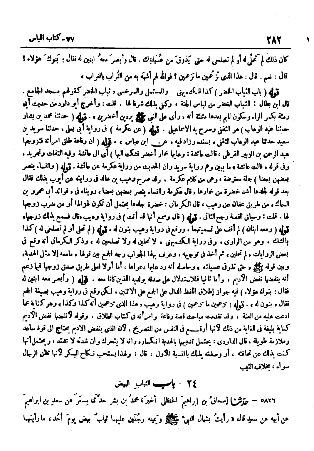 [5825] قَوْلُهُ حَدَّثَنَا مُحَمَّدُ بْنُ بَشَّارٍ حَدَّثَنَا عَبْدُ الْوَهَّابِ هُوَ الثَّقَفِيُّ وَصَرَّحَ بِهِ الْإِسْمَاعِيلِيُّ قَوْلُهُ عَنْ عِكْرِمَةَ فِي رِوَايَةِ أَبِي يَعْلَى حَدَّثَنَا سُوَيْدُ بْنُ سَعِيدٍ حَدَّثَنَا عَبْدُ الْوَهَّابِ الثَّقَفِيُّ بِسَنَدِهِ وَزَاد فِيهِ عَن بن عَبَّاسٍ قَوْلُهُ أَنَّ رِفَاعَةَ طَلَّقَ امْرَأَتَهُ فَتَزَوَّجَهَا عَبْدُ الرَّحْمَنِ بْنُ الزُّبَيْرِ الْقُرَظِيُّ قَالَتْ عَائِشَةُ وَعَلَيْهَا خِمَارٌ أَخْضَرُ فَشَكَتْ إِلَيْهَا أَيْ إِلَى عَائِشَةَ وَفِيهِ الْتِفَاتٌ وَتَجْرِيدٌ وَفِي قَوْلِهِ قَالَتْ عَائِشَةُ مَا يُبَيِّنُ وَهَمَ رِوَايَةِ سُوَيْدٍ وَأَنَّ الحَدِيث من رِوَايَة عِكْرِمَةَ عَنْ عَائِشَةَ قَوْلُهُ وَالنِّسَاءُ يَنْصُرُ بَعْضُهُنَّ بَعْضًا جُمْلَةٌ مُعْتَرَضَةٌ وَهِيَ مِنْ كَلَامِ عِكْرِمَةَ وَقَدْ صَرَّحَ وُهَيْبُ بْنُ خَالِدٍ فِي رِوَايَتِهِ عَنْ أَيُّوبَ بِذَلِكَ فَقَالَ بَعْدَ قَوْلِهِ لَجِلْدُهَا أَشَدُّ خُضْرَةً مِنْ خِمَارِهَا قَالَ عِكْرِمَةُ وَالنِّسَاءُ يَنْصُرُ بَعْضُهُنَّ بَعْضًا رُوِّينَاهُ فِي فَوَائِدِ أَبِي عَمْرِو بْنِ السَّمَّاكِ مِنْ طَرِيقِ عَفَّانَ عَنْ وُهَيْبٍ قَالَ الْكِرْمَانِيُّ خُضْرَةُ جِلْدِهَا يُحْتَمَلُ أَنْ تَكُونَ لِهُزَالِهَا أَوْ مِنْ ضَرْبِ زَوْجِهَا لَهَا قُلْتُ وَسِيَاقُ الْقِصَّةِ رَجَّحَ الثَّانِي قَوْلُهُ قَالَ وَسَمِعَ أَنَّهَا قَدْ أَتَتْ فِي رِوَايَةِ وُهَيْبٍ قَالَ فَسَمِعَ بِذَلِكَ زَوْجُهَا قَوْلُهُ وَمَعَهُ ابْنَانِ لَمْ أَقِفْ عَلَى تَسْمِيَتِهِمَا وَوَقَعَ فِي رِوَايَةِ وُهَيْبٍ بِنُونٍ لَهُ قَوْلُهُ لَمْ تَحِلِّي أَوْ لَمْ تَصْلُحِي لَهُ كَذَا بِالشَّكِّ وَهُوَ مِنَ الرَّاوِي وَفِي رِوَايَةِ الْكُشْمِيهَنِيِّ لَا تَحِلِّينَ لَهُ وَلَا تَصْلُحِينَ لَهُ وَذَكَرَ الْكِرْمَانِيُّ أَنَّهُ وَقَعَ فِي بَعْضِ الرِّوَايَاتِ لَمْ تَحِلِّينَ ثُمَّ أَخَذَ فِي تَوْجِيهِهِ وَعُرِفَ بِهَذَا الْجَوَابِ وَجْهُ الْجَمْعِ بَيْنَ قَوْلِهَا مَا مَعَهُ إِلَّا مِثْلُ الْهُدْبَةِ وَبَيْنَ قَوْلُهُ صَلَّى اللَّهُ عَلَيْهِ وَسَلَّمَ حَتَّى تَذُوقِي عُسَيْلَتَهُ وَحَاصِلُهُ أَنَّهُ رَدَّ عَلَيْهَا دَعْوَاهَا أَمَّا أَوَّلًا فَعَلَى طَرِيقِ صَدَقَ زَوْجُهَا فِيمَا زَعَمَ أَنَّهُ يَنْفُضُهَا نَفْضَ الْأَدِيمِ وَأَمَّا ثَانِيًا فَلِلِاسْتِدْلَالِ عَلَى صِدْقِهِ بِوَلَدَيْهِ اللَّذَيْنِ كَانَا مَعَهُ قَوْلُهُ وَأَبْصَرَ مَعَهُ ابْنَيْنِ لَهُ فَقَالَ بَنُوكَ هَؤُلَاءِ فِيهِ جَوَازُ إِطْلَاقِ اللَّفْظِ الدَّالِّ عَلَى الْجَمْعِ عَلَى الِاثْنَيْنِ لَكِنْ وَقَعَ فِي رِوَايَةِ وُهَيْبٍ بِصِيغَةِ الْجَمْعِ فَقَالَ بَنُونَ لَهُ قَوْلُهُ تَزْعُمِينَ مَا تَزْعُمِينَ فِي رِوَايَةِ وُهَيْبٍ هَذَا الَّذِي تَزْعُمِينَ أَنَّهُ كَذَا وَكَذَا وَهُوَ كِنَايَةٌ عَمَّا ادَّعَتْ عَلَيْهِ مِنَ الْعُنَّةِ وَقَدْ تَقَدَّمَتْ مَبَاحِثُ قِصَّةِ رِفَاعَةَ وَامْرَأَتِهِ فِي كِتَابِ الطَّلَاقِ وَقَوْلُهُ لَأَنْفُضُهَا نَفْضَ الْأَدِيمِ كِنَايَةً بَلِيغَةً فِي الْغَايَةِ مِنْ ذَلِكَ لِأَنَّهَا أَوْقَعُ فِي النَّفْسِ مِنَ التَّصْرِيحِ لِأَنَّ الَّذِي يَنْفُضُ الْأَدِيمَ يَحْتَاجُ إِلَى قُوَّةِ سَاعِدٍ وَمُلَازَمَةٍ طَوِيلَةٍ قَالَ الدَّاوُدِيُّ يُحْتَمَلُ تَشْبِيهُهَا بِالْهُدْبَةِ انْكِسَارُهُ وَأَنَّهُ لَا يَتَحَرَّكُ وَأَنَّ شِدَّتَهُ لَا تَشْتَدُّ وَيُحْتَمَلُ أَنَّهَا كَنَّتْ بِذَلِكَ عَنْ نَحَافَتِهِ أَوْ وَصَفَتْهُ بِذَلِكَ بِالنِّسْبَةِ لِلْأَوَّلِ قَالَ وَلِهَذَا يُسْتَحَبُّ نِكَاحُ الْبِكْرِ لِأَنَّهَا تظن الرِّجَال سَوَاء بِخِلَاف الثّيّب