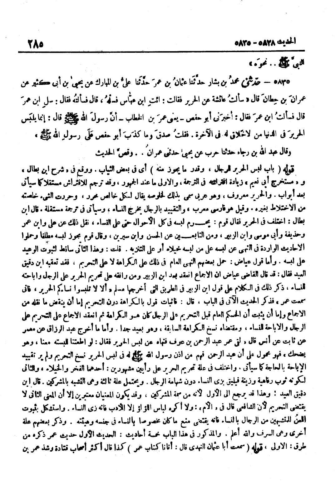 أَيْ فِي بَعْضِ الثِّيَابِ وَوَقَعَ فِي شرح بن بطال ومستخرج أَبِي نُعَيْمٍ زِيَادَةُ افْتِرَاشِهِ فِي التَّرْجَمَةِ وَالْأَوْلَى مَا عِنْدَ الْجُمْهُورِ وَقَدْ تَرْجَمَ لِلِافْتِرَاشِ مُسْتَقِلًّا كَمَا سَيَأْتِي بَعْدَ أَبْوَابٍ وَالْحَرِيرُ مَعْرُوفٌ وَهُوَ عَرَبِيٌّ سُمِّيَ بِذَلِكَ لِخُلُوصِهِ يُقَالُ لِكُلِّ خَالِصٍ مُحَرَّرٌ وَحَرَّرْتُ الشَّيْءَ خَلَّصْتُهُ مِنَ الِاخْتِلَاطِ بِغَيْرِهِ وَقِيلَ هُوَ فَارِسِيٌّ مُعَرَّبٌ وَالتَّقْيِيدُ بِالرِّجَالِ يُخْرِجُ النِّسَاء وَسَيَأْتِي فِي تَرْجَمَة مُسْتَقلَّة قَالَ بن بَطَّالٍ اخْتُلِفَ فِي الْحَرِيرِ فَقَالَ قَوْمٌ يَحْرُمُ لُبْسُهُ فِي كُلِّ الْأَحْوَالِ حَتَّى عَلَى النِّسَاءِ نقل ذَلِك عَن عَليّ وبن عمر وَحُذَيْفَة وَأبي مُوسَى وبن الزبير وَمن التَّابِعين عَن الْحسن وبن سِيرِينَ وَقَالَ قَوْمٌ يَجُوزُ لُبْسُهُ مُطْلَقًا وَحَمَلُوا الْأَحَادِيثَ الْوَارِدَةَ فِي النَّهْيِ عَنْ لُبْسِهِ عَلَى مَنْ لَبِسَهُ خُيَلَاءَ أَوْ عَلَى التَّنْزِيهِ قُلْتُ وَهَذَا الثَّانِي سَاقِطٌ لِثُبُوتِ الْوَعِيدِ عَلَى لُبْسِهِ وَأَمَّا قَوْلُ عِيَاضٍ حَمَلَ بَعْضُهُمُ النَّهْيَ الْعَامَّ فِي ذَلِكَ عَلَى الْكَرَاهَةِ لَا عَلَى التَّحْرِيمِ فقد تعقبه بن دَقِيقِ الْعِيدِ فَقَالَ قَدْ قَالَ الْقَاضِي عِيَاضٌ أَن الْإِجْمَاع انْعَقَد بعد بن الزُّبَيْرِ وَمَنْ وَافَقَهُ عَلَى تَحْرِيمِ الْحَرِيرِ عَلَى الرِّجَالِ وَإِبَاحَتِهِ لِلنِّسَاءِ ذَكَرَ ذَلِكَ فِي الْكَلَامِ على قَول بن الزُّبَيْرِ فِي الطَّرِيقِ الَّتِي أَخْرَجَهَا مُسْلِمٌ أَلَا لَا تُلْبِسُوا نِسَاءَكُمُ الْحَرِيرَ فَإِنِّي سَمِعْتُ عُمَرَ فَذَكَرَ الْحَدِيثَ الْآتِيَ فِي الْبَابِ قَالَ فَإِثْبَاتُ قَوْلٍ بِالْكَرَاهَةِ دُونَ التَّحْرِيمِ إِمَّا أَنْ يَنْقُضَ مَا نَقَلَهُ مِنَ الْإِجْمَاعِ وَإِمَّا أَنْ يُثْبِتَ أَنَّ الْحُكْمَ الْعَامَّ قَبْلَ التَّحْرِيمِ عَلَى الرِّجَالِ كَانَ هُوَ الْكَرَاهَةَ ثُمَّ انْعَقَدَ الْإِجْمَاعُ عَلَى التَّحْرِيمِ عَلَى الرِّجَالِ وَالْإِبَاحَةِ لِلنِّسَاءِ وَمُقْتَضَاهُ نَسْخُ الْكَرَاهَةِ السَّابِقَةِ وَهُوَ بَعِيدٌ جِدًّا وَأَمَّا مَا أَخْرَجَ عَبْدُ الرَّزَّاقِ عَنْ مَعْمَرٍ عَنْ ثَابِتٍ عَنْ أَنَسٍ قَالَ لَقِيَ عُمَرُ عَبْدَ الرَّحْمَنِ بْنَ عَوْفٍ فَنَهَاهُ عَنْ لُبْسِ الْحَرِيرِ فَقَالَ لَوْ أَطَعْتَنَا لَلَبِسْتَهُ مَعَنَا وَهُوَ يَضْحَكُ فَهُوَ مَحْمُولٌ عَلَى أَنَّ عَبْدَ الرَّحْمَنِ فَهِمَ مِنْ أَذِنَ رَسُولِ اللَّهِ صَلَّى اللَّهُ عَلَيْهِ وَسَلَّمَ لَهُ فِي لُبْسِ الْحَرِيرِ نَسْخَ التَّحْرِيمِ وَلَمْ يَرَ تَقْيِيدَ الْإِبَاحَةِ بِالْحَاجَةِ كَمَا سَيَأْتِي وَاخْتُلِفَ فِي عِلَّةِ تَحْرِيمِ الْحَرِيرِ عَلَى رَأْيَيْنِ مَشْهُورَيْنِ أَحَدُهُمَا الْفَخْرُ وَالْخُيَلَاءُ وَالثَّانِي لِكَوْنِهِ ثَوْبَ رَفَاهِيَةٍ وزينة فَيَلِيقُ بِزِيِّ النِّسَاءِ دُونَ شَهَامَةِ الرِّجَالِ وَيَحْتَمِلُ عِلّة ثَالِثَة وَهِي التَّشَبُّه بالمشركين قَالَ بن دَقِيقِ الْعِيدِ وَهَذَا قَدْ يَرْجِعُ إِلَى الْأَوَّلِ لِأَنَّهُ مِنْ سِمَةِ الْمُشْرِكِينَ وَقَدْ يَكُونُ الْمَعْنَيَانِ مُعْتَبَرَيْنِ إِلَّا أَنَّ الْمَعْنَى الثَّانِيَ لَا يَقْتَضِي التَّحْرِيمَ لِأَنَّ الشَّافِعِيَّ قَالَ فِي الْأُمِّ وَلَا أَكْرَهُ لِبَاسَ اللُّؤْلُؤِ إِلَّا لِلْأَدَبِ فَإِنَّهُ زِيُّ النِّسَاءِ وَاسْتَشْكَلَ بِثُبُوتِ اللَّعْنِ لِلْمُتَشَبِّهِينَ مِنَ الرِّجَالِ بِالنِّسَاءِ فَإِنَّهُ يَقْتَضِي مَنْعَ مَا كَانَ مَخْصُوصًا بِالنِّسَاءِ فِي جِنْسِهِ وَهَيْئَتِهِ وَذَكَرَ بَعْضُهُمْ عِلَّةً أُخْرَى وَهِيَ السَّرَفُ وَاللَّهُ أَعْلَمُ وَالْمَذْك