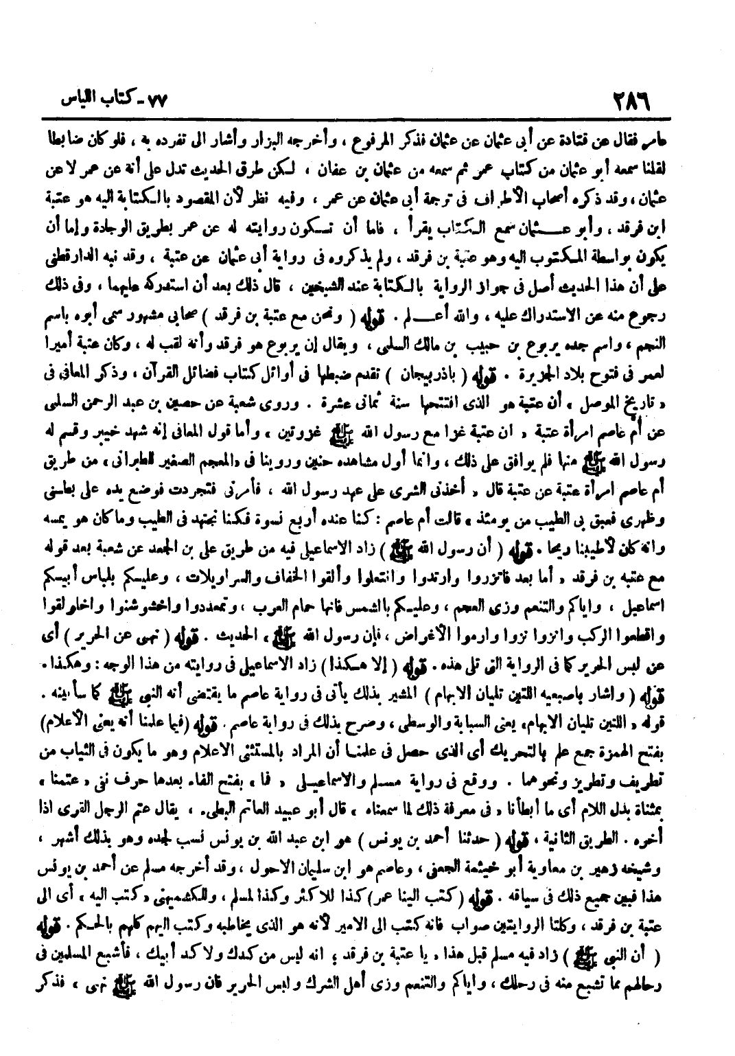 عَامِرٍ فَقَالَ عَنْ قَتَادَةَ عَنْ أَبِي عُثْمَانَ عَنْ عُثْمَانَ فَذَكَرَ الْمَرْفُوعَ وَأَخْرَجَهُ الْبَزَّارُ وَأَشَارَ إِلَى تَفَرُّدِهِ بِهِ فَلَوْ كَانَ ضَابِطًا لَقُلْنَا سَمِعَهُ أَبُو عُثْمَانَ مِنْ كِتَابِ عُمَرَ ثُمَّ سَمِعَهُ مِنْ عُثْمَانَ بْنِ عَفَّانَ لَكِنْ طُرُقُ الْحَدِيثِ تَدُلُّ عَلَى أَنَّهُ عَنْ عُمَرَ لَا عَنْ عُثْمَانَ وَقَدْ ذَكَرَهُ أَصْحَابُ الْأَطْرَافِ فِي تَرْجَمَةِ أَبِي عُثْمَانَ عَنْ عُمَرَ وَفِيهِ نَظَرٌ لِأَنَّ الْمَقْصُودَ بِالْكِتَابَةِ إِلَيْهِ هُوَ عُتْبَةُ بْنُ فَرْقَدٍ وَأَبُو عُثْمَانَ سَمِعَ الْكِتَابَ يُقْرَأُ فَإِمَّا أَنْ تَكُونَ رِوَايَتُهُ لَهُ عَنْ عُمَرَ بِطَرِيقِ الْوِجَادَةِ وَإِمَّا أَنْ يَكُونَ بِوَاسِطَةِ الْمَكْتُوبِ إِلَيْهِ وَهُوَ عُتْبَةُ بْنُ فَرْقَدٍ وَلَمْ يَذْكُرُوهُ فِي رِوَايَةِ أَبِي عُثْمَانَ عَنْ عُتْبَةَ وَقَدْ نَبَّهَ الدَّارَقُطْنِيُّ عَلَى أَنَّ هَذَا الْحَدِيثَ أَصْلٌ فِي جَوَازِ الرِّوَايَةِ بِالْكِتَابَةِ عِنْدَ الشَّيْخَيْنِ قَالَ ذَلِكَ بَعْدَ أَنِ اسْتَدْرَكَهُ عَلَيْهِمَا وَفِي ذَلِكَ رُجُوعٌ مِنْهُ عَنِ الِاسْتِدْرَاكِ عَلَيْهِ وَاللَّهُ أَعْلَمُ قَوْلُهُ وَنَحْنُ مَعَ عُتْبَةَ بْنِ فَرْقَدٍ صَحَابِيٌّ مَشْهُورٌ سُمِّيَ أَبُوهُ بِاسْمِ النَّجْمِ وَاسْمُ جَدِّهِ يَرْبُوعُ بْنُ حَبِيبِ بْنِ مَالِكٍ السُّلَمِيُّ وَيُقَالُ إِنَّ يَرْبُوعَ هُوَ فَرْقَدٌ وَأَنَّهُ لَقَبٌ لَهُ وَكَانَ عُتْبَةُ أَمِيرًا لِعُمَرَ فِي فُتُوحِ بِلَادِ الْجَزِيرَةِ قَوْلُهُ بِأَذْرَبِيجَانَ تَقَدَّمَ ضَبْطُهَا فِي أَوَائِلِ كِتَابِ فَضَائِلِ الْقُرْآنِ وَذَكَرَ الْمُعَافَى فِي تَارِيخِ الْمَوْصِلِ أَنَّ عُتْبَةَ هُوَ الَّذِي افْتَتَحَهَا سَنَةَ ثَمَانِي عَشْرَةَ وَرَوَى شُعْبَةُ عَنْ حُصَيْنِ بْنِ عَبْدِ الرَّحْمَنِ السُّلَمِيِّ عَنْ أُمِّ عَاصِمٍ امْرَأَةِ عُتْبَةَ أَنَّ عُتْبَةَ غَزَا مَعَ رَسُولِ اللَّهِ صَلَّى اللَّهُ عَلَيْهِ وَسَلَّمَ غَزْوَتَيْنِ وَأَمَّا قَوْلُ الْمُعَافَى إِنَّهُ شَهِدَ خَيْبَرَ وَقَسَمَ لَهُ رَسُولُ اللَّهِ صَلَّى اللَّهُ عَلَيْهِ وَسَلَّمَ مِنْهَا فَلَمْ يُوَافِقْ على ذَلِك وَإِنَّمَا أول مشاهده حنين وروينا فِي الْمُعْجَمِ الصَّغِيرِ لِلطَبَرَانِيِّ مِنْ طَرِيقِ أُمِّ عَاصِمٍ امْرَأَةِ عُتْبَةَ عَنْ عُتْبَةَ قَالَ أَخَذَنِي الشَّرَى عَلَى عَهْدِ رَسُولِ اللَّهِ فَأَمَرَنِي فَتَجَرَّدْتُ فَوَضَعَ يَدَهُ عَلَى بَطْنِي وَظَهْرِي فَعَبِقَ بِي الطِّيبُ مِنْ يَوْمئِذٍ قَالَتْ أُمُّ عَاصِمٍ كُنَّا عِنْدَهُ أَرْبَعَ نِسْوَةٍ فَكُنَّا نَجْتَهِدُ فِي الطِّيبِ وَمَا كَانَ هُوَ يَمَسُّهُ وَإِنَّهُ كَانَ لَأَطْيَبَنَا رِيحًا قَوْلُهُ أَنَّ رَسُولَ اللَّهِ صَلَّى اللَّهُ عَلَيْهِ وَسَلَّمَ زَادَ الْإِسْمَاعِيلِيُّ فِيهِ مِنْ طَرِيقِ عَلِيِّ بْنِ الْجَعْدِ عَنْ شُعْبَةَ بَعْدَ قَوْلِهِ مَعَ عُتْبَةَ بْنِ فَرْقَدٍ أَمَّا بَعْدُ فَاتَّزِرُوا وَارْتَدُوا وَانْتَعِلُوا وَأَلْقُوا الْخِفَافَ وَالسَّرَاوِيلَاتِ وَعَلَيْكُمْ بِلِبَاسِ أَبِيكُمْ إِسْمَاعِيلَ وَإِيَّاكُمْ وَالتَّنَعُّمَ وَزِيَّ الْعَجَمِ وَعَلَيْكُمْ بِالشَّمْسِ فَإِنَّهَا حَمَّامُ الْعَرَبِ وَتَمَعْدَدُوا وَاخْشَوْشِنُوا وَاخْلَوْلَقُوا وَاقْطَعُوا الرَّكْبَ وَانْزُوا نَزْوًا وَارْمُوا الْأَغْرَاضَ فَإِنَّ رَسُولُ اللَّهِ صَلَّى اللَّهُ عَلَيْهِ وَسَلَّمَ الْحَدِيثَ قَوْلُهُ نَهَى عَنِ الْحَرِيرِ أَيْ عَنْ لُبْسِ الْحَرِيرِ كَمَا فِي الرِّوَايَةِ الَّتِي تَلِي هَذِهِ قَوْلُهُ إِلَّا هَكَذَا زَادَ الْإِسْمَاعِيلِيُّ فِي رِوَايَتِهِ مِنْ هَذَا الْوَجْهِ وَهَكَذَا قَوْلُهُ وَأَشَارَ بِإِصْبَعَيْهِ اللَّتَيْن