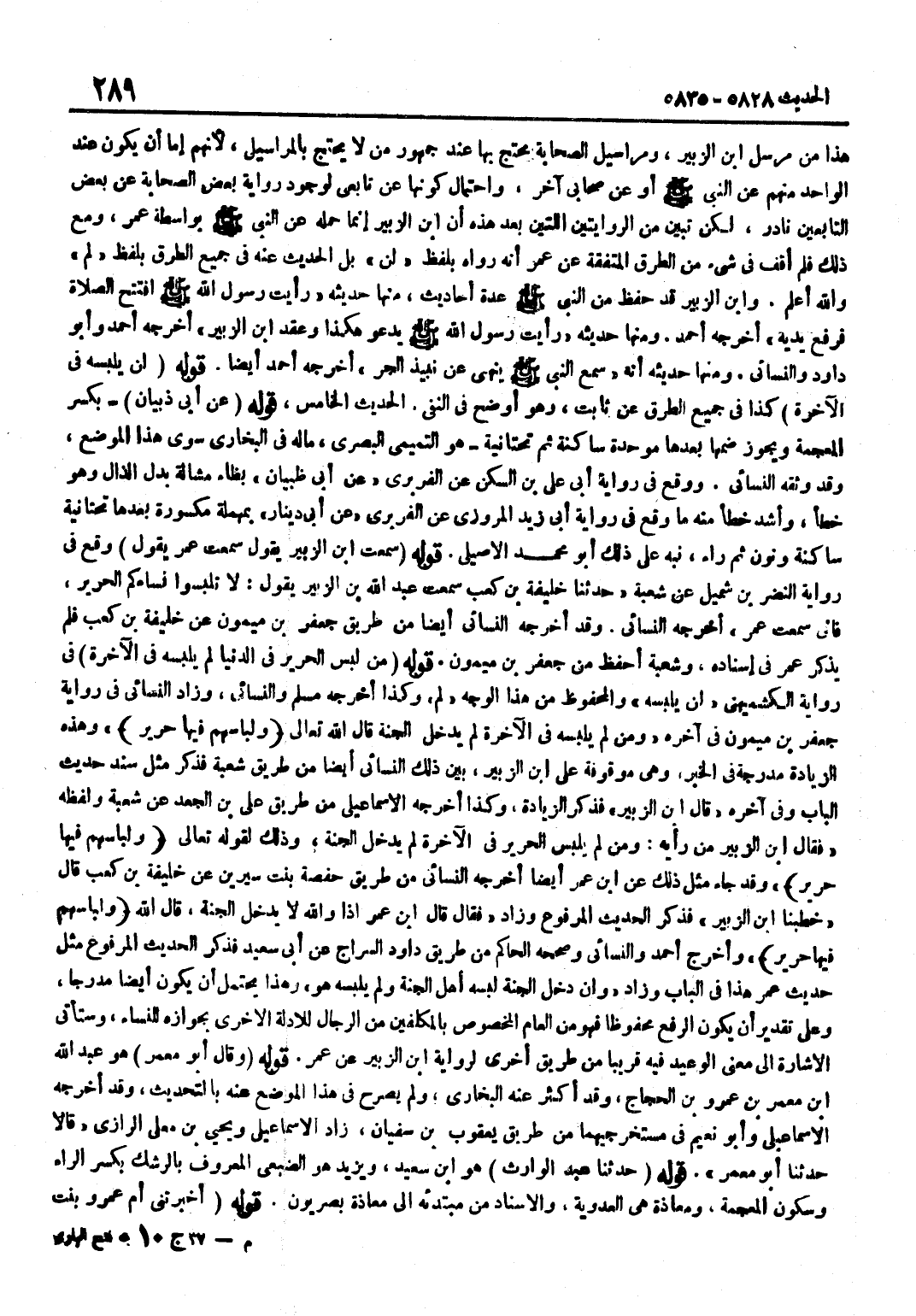 هَذَا من مُرْسل بن الزُّبَيْرِ وَمَرَاسِيلُ الصَّحَابَةِ مُحْتَجٌّ بِهَا عِنْدَ جُمْهُورِ مَنْ لَا يَحْتَجُّ بِالْمَرَاسِيلِ لِأَنَّهُمْ إِمَّا أَنْ يَكُونَ عِنْدَ الْوَاحِدِ مِنْهُمْ عَنِ النَّبِيِّ صَلَّى اللَّهُ عَلَيْهِ وَسَلَّمَ أَوْ عَنْ صَحَابِيٍّ آخَرَ وَاحْتِمَالُ كَوْنِهَا عَنْ تَابِعِيٍّ لِوُجُودِ رِوَايَةِ بَعْضِ الصَّحَابَةِ عَنْ بَعْضِ التَّابِعِينَ نَادِرٌ لَكِنْ تَبَيَّنَ من الرِّوَايَتَيْنِ اللَّتَيْنِ بعد هَذِه أَن بن الزُّبَيْرِ إِنَّمَا حَمَلَهُ عَنِ النَّبِيِّ صَلَّى اللَّهُ عَلَيْهِ وَسَلَّمَ بِوَاسِطَةِ عُمَرَ وَمَعَ ذَلِكَ فَلَمْ أَقِفْ فِي شَيْءٍ مِنَ الطُّرُقِ الْمُتَّفِقَةِ عَنْ عُمَرَ أَنَّهُ رَوَاهُ بِلَفْظِ لَنْ بَلِ الْحَدِيثُ عَنْهُ فِي جَمِيعِ الطُّرُقِ بِلَفْظِ لَمْ وَاللَّهُ أعلم وبن الزُّبَيْرِ قَدْ حَفِظَ مِنَ النَّبِيِّ صَلَّى اللَّهُ عَلَيْهِ وَسَلَّمَ عِدَّةَ أَحَادِيثَ مِنْهَا حَدِيثُهُ رَأَيْتُ رَسُولَ اللَّهِ صَلَّى اللَّهُ عَلَيْهِ وَسَلَّمَ افْتَتَحَ الصَّلَاةَ فَرَفَعَ يَدَيْهِ أَخْرَجَهُ أَحْمَدُ وَمِنْهَا حَدِيثُهُ رَأَيْتُ رَسُولَ اللَّهِ صَلَّى اللَّهُ عَلَيْهِ وَسَلَّمَ يَدْعُو هَكَذَا وَعقد بن الزُّبَيْرِ أَخْرَجَهُ أَحْمَدُ وَأَبُو دَاوُدَ وَالنَّسَائِيُّ وَمِنْهَا حَدِيثُهُ أَنَّهُ سَمِعَ النَّبِيَّ صَلَّى اللَّهُ عَلَيْهِ وَسَلَّمَ يَنْهَى عِنِ نَبِيذِ الْجَرِّ أَخْرَجَهُ أَحْمَدُ أَيْضًا قَوْلُهُ لَنْ يَلْبَسَهُ فِي الْآخِرَةِ كَذَا فِي جَمِيعِ الطُّرُقِ عَنْ ثَابِتٍ وَهُوَ أَوْضَحُ فِي النَّفْيِ الْحَدِيثُ الْخَامِسُ