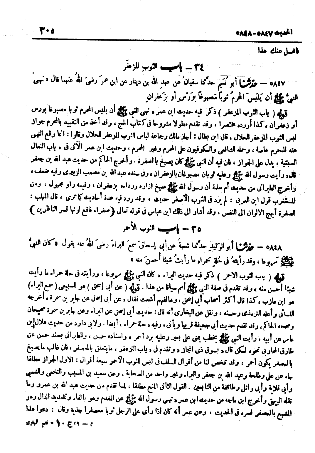 ذكر فِيهِ حَدِيثَ بن عُمَرَ نَهَى النَّبِيُّ صَلَّى اللَّهُ عَلَيْهِ وَسَلَّمَ أَنْ يَلْبَسَ الْمُحْرِمُ ثَوْبًا مَصْبُوغًا بِوَرْسٍ أَوْ زَعْفَرَانٍ كَذَا أَوْرَدَهُ مُخْتَصَرًا وَقَدْ تَقَدَّمَ مُطَوَّلًا مَشْرُوحًا فِي كِتَابِ الْحَجِّ وَقَدْ أُخِذَ مِنَ التَّقْيِيدِ بِالْمُحْرِمِ جَوَازُ لُبْسِ الثَّوْبِ الْمُزَعْفَرِ لِلْحَلَالِ قَالَ بن بَطَّالٍ أَجَازَ مَالِكٌ وَجَمَاعَةٌ لِبَاسَ الثَّوْبِ الْمُزَعْفَرِ لِلْحَلَالِ وَقَالُوا إِنَّمَا وَقَعَ النَّهْيُ عَنْهُ لِلْمُحْرِمِ خَاصَّةً وَحَمَلَهُ الشَّافِعِيُّ وَالْكُوفِيُّونَ عَلَى الْمُحْرِمِ وَغَيْرِ الْمحرم وَحَدِيث بن عُمَرَ الْآتِي فِي بَابِ النِّعَالِ السِّبْتِيَّةِ يَدُلُّ عَلَى الْجَوَازِ فَإِنَّ فِيهِ أَنَّ النَّبِيَّ صَلَّى اللَّهُ عَلَيْهِ وَسَلَّمَ كَانَ يَصْبُغُ بِالصُّفْرَةِ وَأَخْرَجَ الْحَاكِمُ مِنْ حَدِيثِ عَبْدِ اللَّهِ بْنِ جَعْفَرٍ قَالَ رَأَيْتُ رَسُولَ اللَّهِ صَلَّى اللَّهُ عَلَيْهِ وَسَلَّمَ وَعَلَيْهِ ثَوْبَانِ مَصْبُوغَانِ بِالزَّعْفَرَانِ وَفِي سَنَدِهِ عَبْدُ اللَّهِ بْنُ مُصْعَبٍ الزُّبَيْرِيُّ وَفِيهِ ضَعْفٌ وَأَخْرَجَ الطَّبَرَانِيُّ مِنْ حَدِيثِ أُمِّ سَلَمَةَ أَنَّ رَسُولَ اللَّهِ صَلَّى اللَّهُ عَلَيْهِ وَسَلَّمَ صَبَغَ إِزَارَهُ وَرِدَاءَهُ بِزَعْفَرَانٍ وَفِيهِ رَاوٍ مَجْهُولٌ وَمِنَ المستغرب قَول بن الْعَرَبِيِّ لَمْ يَرِدْ فِي الثَّوْبِ الْأَصْفَرِ حَدِيثٌ وَقَدْ وَرَدَ فِيهِ عِدَّةُ أَحَادِيثَ كَمَا تَرَى قَالَ الْمُهَلَّبُ الصُّفْرَةُ أَبْهَجُ الْأَلْوَانِ إِلَى النَّفْسِ وَقد أَشَارَ إِلَى ذَلِك بن عَبَّاسٍ فِي قَوْلِهِ تَعَالَى صَفْرَاءُ فَاقِعٌ لَوْنُهَا تسر الناظرين قَوْلُهُ بَابُ الثَّوْبِ الْأَحْمَرِ ذَكَرَ فِيهِ حَدِيثَ الْبَرَاءِ كَانَ النَّبِيُّ صَلَّى اللَّهُ عَلَيْهِ وَسَلَّمَ مَرْبُوعًا وَرَأَيْتُهُ فِي حُلَّةٍ حَمْرَاءَ مَا رَأَيْتُ شَيْئًا أَحْسَنَ مِنْهُ وَقَدْ تَقَدَّمَ فِي صِفَةِ النَّبِيِّ صَلَّى اللَّهُ عَلَيْهِ وَسَلَّمَ أَتَمَّ سِيَاقًا من هَذَا