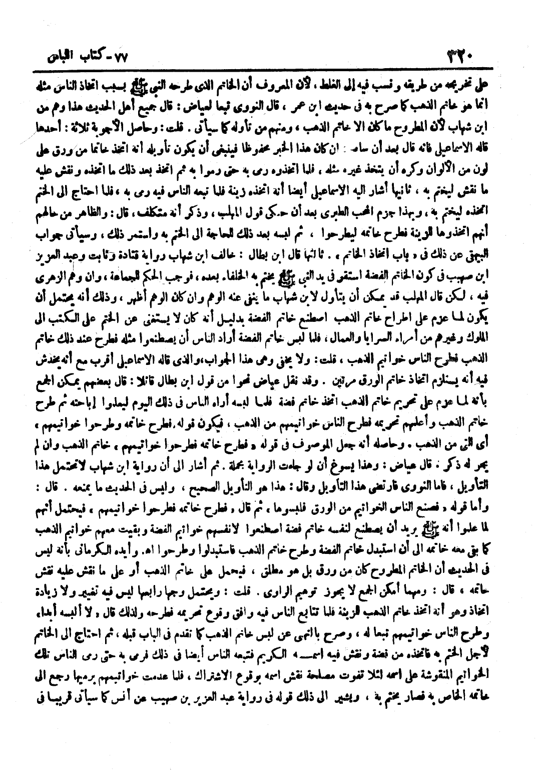 عَلَى تَخْرِيجِهِ مِنْ طَرِيقِهِ وَنُسِبَ فِيهِ إِلَى الْغَلَطِ لِأَنَّ الْمَعْرُوفَ أَنَّ الْخَاتَمَ الَّذِي طَرَحَهُ النَّبِيُّ صَلَّى اللَّهُ عَلَيْهِ وَسَلَّمَ بِسَبَبِ اتِّخَاذِ النَّاسِ مِثْلَهُ إِنَّمَا هُوَ خَاتَمُ الذَّهَبِ كَمَا صرح بِهِ فِي حَدِيث بن عُمَرَ قَالَ النَّوَوِيُّ تَبَعًا لِعِيَاضٍ قَالَ جَمِيعُ أهل الحَدِيث هَذَا وهم من بن شِهَابٍ لِأَنَّ الْمَطْرُوحَ مَا كَانَ إِلَّا خَاتَمَ الذَّهَبِ وَمِنْهُمْ مَنْ تَأَوَّلَهُ كَمَا سَيَأْتِي قُلْتُ وَحَاصِلُ الْأَجْوِبَةِ ثَلَاثَةٌ أَحَدُهَا قَالَهُ الْإِسْمَاعِيلِيُّ فَإِنَّهُ قَالَ بَعْدَ أَنْ سَاقَهُ إِنْ كَانَ هَذَا الْخَبَرُ مَحْفُوظًا فَيَنْبَغِي أَنْ يَكُونَ تَأْوِيلُهُ أَنَّهُ اتَّخَذَ خَاتَمًا مِنْ وَرِقٍ عَلَى لَوْنٍ مِنَ الْأَلْوَانِ وَكَرِهَ أَنْ يَتَّخِذَ غَيْرُهُ مِثْلَهُ فَلَمَّا اتَّخَذُوهُ رَمَى بِهِ حَتَّى رَمَوْا بِهِ ثُمَّ اتَّخَذَ بَعْدَ ذَلِكَ مَا اتَّخَذَهُ وَنَقَشَ عَلَيْهِ مَا نُقِشَ لِيَخْتِمَ بِهِ ثَانِيهَا أَشَارَ إِلَيْهِ الْإِسْمَاعِيلِيُّ أَيْضًا أَنَّهُ اتَّخَذَهُ زِينَةً فَلَمَّا تَبِعَهُ النَّاسُ فِيهِ رَمَى بِهِ فَلَمَّا احْتَاجَ إِلَى الْخَتْمِ اتَّخَذَهُ لِيَخْتِمَ بِهِ وَبِهَذَا جَزَمَ الْمُحِبُّ الطَّبَرِيُّ بَعْدَ أَنْ حَكَى قَوْلَ الْمُهَلَّبِ وَذَكَرَ أَنَّهُ مُتَكَلِّفٌ قَالَ وَالظَّاهِرُ مِنْ حَالِهِمْ أَنَّهُمُ اتَّخَذُوهَا لِلزِّينَةِ فَطَرَحَ خَاتَمَهُ لِيَطْرَحُوا ثُمَّ لَبِسَهُ بَعْدَ ذَلِكَ لِلْحَاجَةِ إِلَى الْخَتْمِ بِهِ وَاسْتَمَرَّ ذَلِكَ وَسَيَأْتِي جَوَابُ الْبَيْهَقِيِّ عَنْ ذَلِكَ فِي بَاب اتِّخَاذ الْخَاتم ثَالِثهَا قَالَ بن بطال خَالف بن شِهَابٍ رِوَايَةَ قَتَادَةَ وَثَابِتٍ وَعَبْدِ الْعَزِيزِ بْنِ صُهَيْبٍ فِي كَوْنِ الْخَاتَمِ الْفِضَّةِ اسْتَقَرَّ فِي يَدِ النَّبِيِّ صَلَّى اللَّهُ عَلَيْهِ وَسَلَّمَ يَخْتِمُ بِهِ الْخُلَفَاءُ بَعْدَهُ فَوَجَبَ الْحُكْمُ لِلْجَمَاعَةِ وَإِنْ وَهِمَ الزُّهْرِيُّ فِيهِ لَكِنْ قَالَ الْمُهَلَّبُ قَدْ يُمْكِنُ أَنْ يُتَأَوَّلَ لِابْنِ شِهَابٍ مَا يَنْفِي عَنْهُ الْوَهْمَ وَإِنْ كَانَ الْوَهْمُ أَظْهَرَ وَذَلِكَ أَنَّهُ يُحْتَمَلُ أَنْ يَكُونَ لَمَّا عَزَمَ عَلَى إِطْرَاحِ خَاتَمِ الذَّهَبِ اصْطَنَعَ خَاتَمَ الْفِضَّةِ بِدَلِيلِ أَنَّهُ كَانَ لَا يَسْتَغْنِي عَنِ الْخَتْمِ عَلَى الْكُتُبِ إِلَى الْمُلُوكِ وَغَيْرِهِمْ مِنْ أَمَرَاءِ السَّرَايَا وَالْعُمَّالِ فَلَمَّا لَبِسَ خَاتَمَ الْفِضَّةِ أَرَادَ النَّاسُ أَنْ يَصْطَنِعُوا مِثْلَهُ فَطَرَحَ عِنْدَ ذَلِكَ خَاتَمَ الذَّهَبِ فَطَرَحَ النَّاسُ خَوَاتِيمَ الذَّهَبِ قُلْتُ وَلَا يَخْفَى وَهْيُ هَذَا الْجَوَابُ وَالَّذِي قَالَهُ الْإِسْمَاعِيلِيُّ أَقْرَبُ مَعَ أَنَّهُ يَخْدِشُ فِيهِ أَنَّهُ يَسْتَلْزِمُ اتِّخَاذ خَاتم الْوَرِقِ مَرَّتَيْنِ وَقَدْ نَقَلَ عِيَاضٌ نَحْوًا مِنْ قَول بن بَطَّالٍ قَائِلًا قَالَ بَعْضُهُمْ يُمْكِنُ الْجَمْعُ بِأَنَّهُ لَمَّا عَزَمَ عَلَى تَحْرِيمِ خَاتَمِ الذَّهَبِ اتَّخَذَ خَاتَمَ فِضَّةٍ فَلَمَّا لَبِسَهُ أَرَاهُ النَّاسَ فِي ذَلِكَ الْيَوْمِ لِيَعْلَمُوا إِبَاحَتَهُ ثُمَّ طَرَحَ خَاتَمَ الذَّهَبِ وَأَعْلَمَهُمْ تَحْرِيمَهُ فَطَرَحَ النَّاسُ خَوَاتِيمَهُمْ مِنَ الذَّهَبِ فَيَكُونُ قَوْلُهُ فَطَرَحَ خَاتَمَهُ وَطَرَحُوا خَوَاتِيمَهُمْ أَيِ الَّتِي مِنَ الذَّهَبِ وَحَاصِلُهُ أَنَّهُ جَعَلَ الْمَوْصُوفَ فِي قَوْلِهِ فَطَرَحَ خَاتَمَهُ فَطَرَحُوا خَوَاتِيمَهُمْ خَاتَمَ الذَّهَبِ وَإِنْ لَمْ يَجْرِ لَهُ ذِكْرٌ قَالَ عِيَاضٌ وَهَذَا يُسَوِّغُ أَنْ لَوْ جَاءَتِ الرِّوَايَةُ مُجْمَلَةً ثُمَّ أَشَارَ إِلَى أَنَّ 