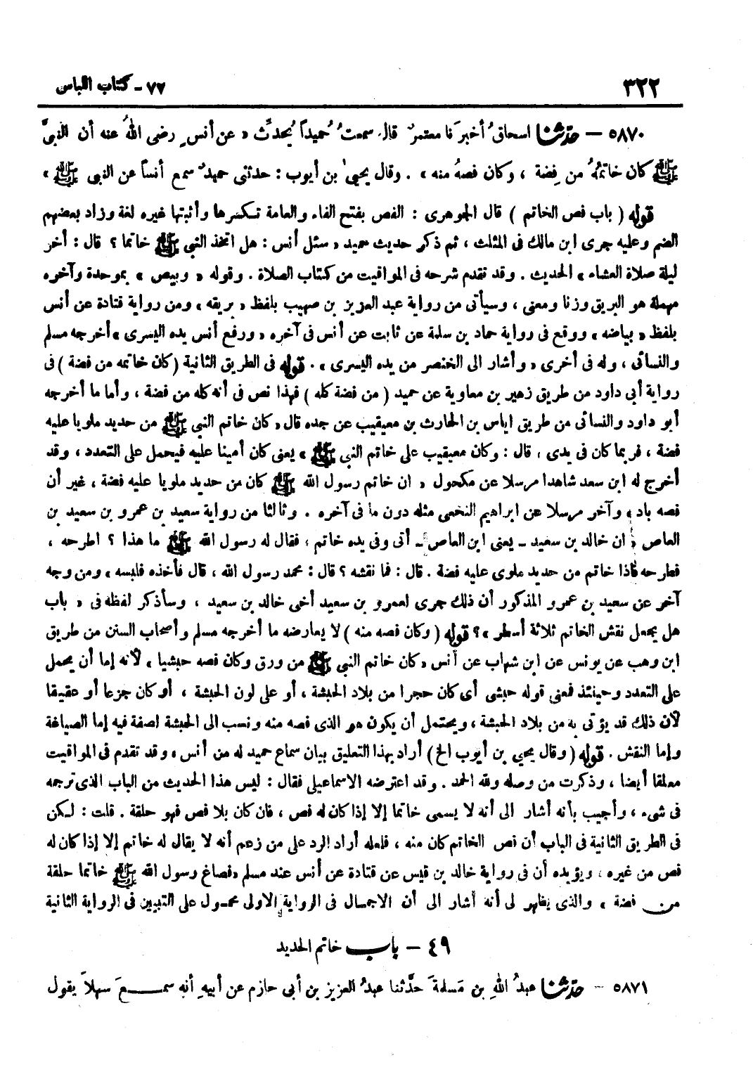 [5870] كَانَ خَاتَمُهُ مِنْ فِضَّةٍ فِي رِوَايَةِ أَبِي دَاوُدَ مِنْ طَرِيقِ زُهَيْرِ بْنِ مُعَاوِيَةَ عَنْ حُمَيْدٍ مِنْ فِضَّةٍ كُلُّهُ فَهَذَا نَصٌّ فِي أَنَّهُ كُلَّهُ مِنْ فِضَّةٍ وَأَمَّا مَا أَخْرَجَهُ أَبُو دَاوُدَ وَالنَّسَائِيُّ مِنْ طَرِيقِ إِيَاسِ بْنِ الْحَارِثِ بْنِ مُعَيْقِيبٍ عَنْ جَدِّهِ قَالَ كَانَ خَاتَمُ النَّبِيِّ صَلَّى اللَّهُ عَلَيْهِ وَسَلَّمَ مِنْ حَدِيدٍ مَلْوِيًّا عَلَيْهِ فِضَّةٌ فَرُبَّمَا كَانَ فِي يَدي قَالَ وَكَانَ مُعَيْقِيبٌ عَلَى خَاتَمِ النَّبِيِّ صَلَّى اللَّهُ عَلَيْهِ وَسَلَّمَ يَعْنِي كَانَ أَمِينًا عَلَيْهِ فَيحمل على التَّعَدُّد وَقد أخرج لَهُ بن سَعْدٍ شَاهِدًا مُرْسَلًا عَنْ مَكْحُولٍ أَنَّ خَاتَمُ رَسُولِ اللَّهِ صَلَّى اللَّهُ عَلَيْهِ وَسَلَّمَ كَانَ مِنْ حَدِيدٍ مَلْوِيًّا عَلَيْهِ فِضَّةٌ غَيْرَ أَنَّ قصه بَادٍ وَآخَرَ مُرْسَلًا عَنْ إِبْرَاهِيمَ النَّخَعِيِّ مِثْلَهُ دُونَ مَا فِي آخِرِهِ وَثَالِثًا مِنْ رِوَايَةِ سَعِيدُ بْنُ عَمْرِو بْنِ سَعِيدِ بْنِ الْعَاصِ أَن خَالِد بن سعيد يَعْنِي بن الْعَاصِ أَتَى وَفِي يَدِهِ خَاتَمٌ فَقَالَ لَهُ رَسُولُ اللَّهِ صَلَّى اللَّهُ عَلَيْهِ وَسَلَّمَ مَا هَذَا اطْرَحْهُ فَطَرَحَهُ فَإِذَا خَاتَمٌ مِنْ حَدِيدٍ مَلْوِيٌّ عَلَيْهِ فِضَّةٌ قَالَ فَمَا نَقْشُهُ قَالَ مُحَمَّدٌ رَسُولُ اللَّهِ قَالَ فَأَخَذَهُ فَلَبِسَهُ وَمِنْ وَجْهٍ آخَرَ عَنْ سَعِيدِ بْنِ عَمْرٍو الْمَذْكُورِ أَنَّ ذَلِكَ جَرَى لِعَمْرِو بْنِ سَعِيدٍ أَخِي خَالِدِ بْنِ سَعِيدٍ وَسَأَذْكُرُ لَفْظَهُ فِي بَابِ هَلْ يُجْعَلُ نَقْشُ الْخَاتَمِ ثَلَاثَةَ أَسْطُرٍ قَوْلُهُ وَكَانَ فَصُّهُ مِنْهُ لَا يُعَارِضُهُ مَا أَخْرَجَهُ مُسلم وَأَصْحَاب السّنَن من طَرِيق بن وهب عَن يُونُس عَن بن شِهَابٍ عَنْ أَنَسٍ كَانَ خَاتَمُ النَّبِيِّ صَلَّى اللَّهُ عَلَيْهِ وَسَلَّمَ مِنْ وَرِقٍ وَكَانَ فَصُّهُ حَبَشِيًّا لِأَنَّهُ إِمَّا أَنْ يُحْمَلَ عَلَى التَّعَدُّدِ وَحِينَئِذٍ فَمَعْنَى قَوْلِهِ حَبَشِيٌّ أَيْ كَانَ حَجَرًا مِنْ بِلَادِ الْحَبَشَةِ أَوْ عَلَى لَوْنِ الْحَبَشَةِ أَوْ كَانَ جَزْعًا أَوْ عَقِيقًا لِأَنَّ ذَلِكَ قَدْ يُؤْتَى بِهِ مِنْ بِلَادِ الْحَبَشَةِ وَيُحْتَمَلُ أَنْ يَكُونَ هُوَ الَّذِي فَصُّهُ مِنْهُ وَنُسِبَ إِلَى الْحَبَشَةِ لِصِفَةٍ فِيهِ إِمَّا الصِّيَاغَةُ وَإِمَّا النَّقْشُ قَوْلُهُ وَقَالَ يَحْيَى بْنُ أَيُّوبَ إِلَخْ أَرَادَ بِهَذَا التَّعْلِيقِ بَيَانَ سَمَاعِ حُمَيْدٍ لَهُ مِنْ أَنَسٍ وَقَدْ تَقَدَّمَ فِي الْمَوَاقِيتِ مُعَلَّقًا أَيْضًا وَذَكَرْتُ مَنْ وَصَلَهُ وَلِلَّهِ الْحَمْدُ وَقَدِ اعْتَرَضَهُ الْإِسْمَاعِيلِيُّ فَقَالَ لَيْسَ هَذَا الْحَدِيثُ مِنَ الْبَابِ الَّذِي تَرْجَمَهُ فِي شَيْءٍ وَأُجِيبُ بِأَنَّهُ أَشَارَ إِلَى أَنَّهُ لَا يُسَمَّى خَاتَمًا إِلَّا إِذَا كَانَ لَهُ فَصٌّ فَإِنْ كَانَ بِلَا فَصٍّ فَهُوَ حَلْقَةٌ قُلْتُ لَكِنْ فِي الطَّرِيقِ الثَّانِيَةِ فِي الْبَابِ أَنَّ فَصَّ الْخَاتَمِ كَانَ مِنْهُ فَلَعَلَّهُ أَرَادَ الرَّدَّ عَلَى مَنْ زَعَمَ أَنَّهُ لَا يُقَالُ لَهُ خَاتَمٌ إِلَّا إِذَا كَانَ لَهُ فَصٌّ مِنْ غَيْرِهِ وَيُؤَيِّدُهُ أَنَّ فِي رِوَايَةِ خَالِدِ بْنِ قَيْسٍ عَنْ قَتَادَةَ عَنْ أَنَسٍ عِنْدَ مُسْلِمٍ فَصَاغَ رَسُولُ اللَّهِ صَلَّى اللَّهُ عَلَيْهِ وَسَلَّمَ خَاتَمًا حَلْقَةً مِنْ فِضَّةٍ وَالَّذِي يَظْهَرُ لِي أَنَّهُ أَشَارَ إِلَى أَنَّ الْإِجْمَالَ فِي الرِّوَايَةِ الْأُولَى مَحْمُولٌ عَلَى التَّبْيِين فِي الرِّوَايَة الثَّانِيَة