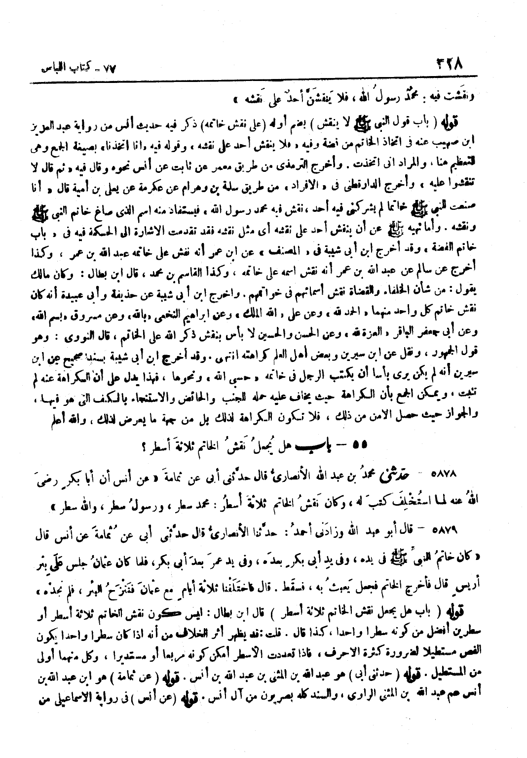 بِضَمِّ أَوَّلِهِ عَلَى نَقْشِ خَاتَمِهِ ذَكَرَ فِيهِ حَدِيثَ أَنَسٍ مِنْ رِوَايَةِ عَبْدِ الْعَزِيزِ بْنِ صُهَيْبٍ عَنْهُ فِي اتِّخَاذِ الْخَاتَمِ مِنْ فِضَّةٍ وَفِيهِ فَلَا يَنْقُشْ أَحَدٌ عَلَى نَقْشِهِ وَقَوْلُهُ