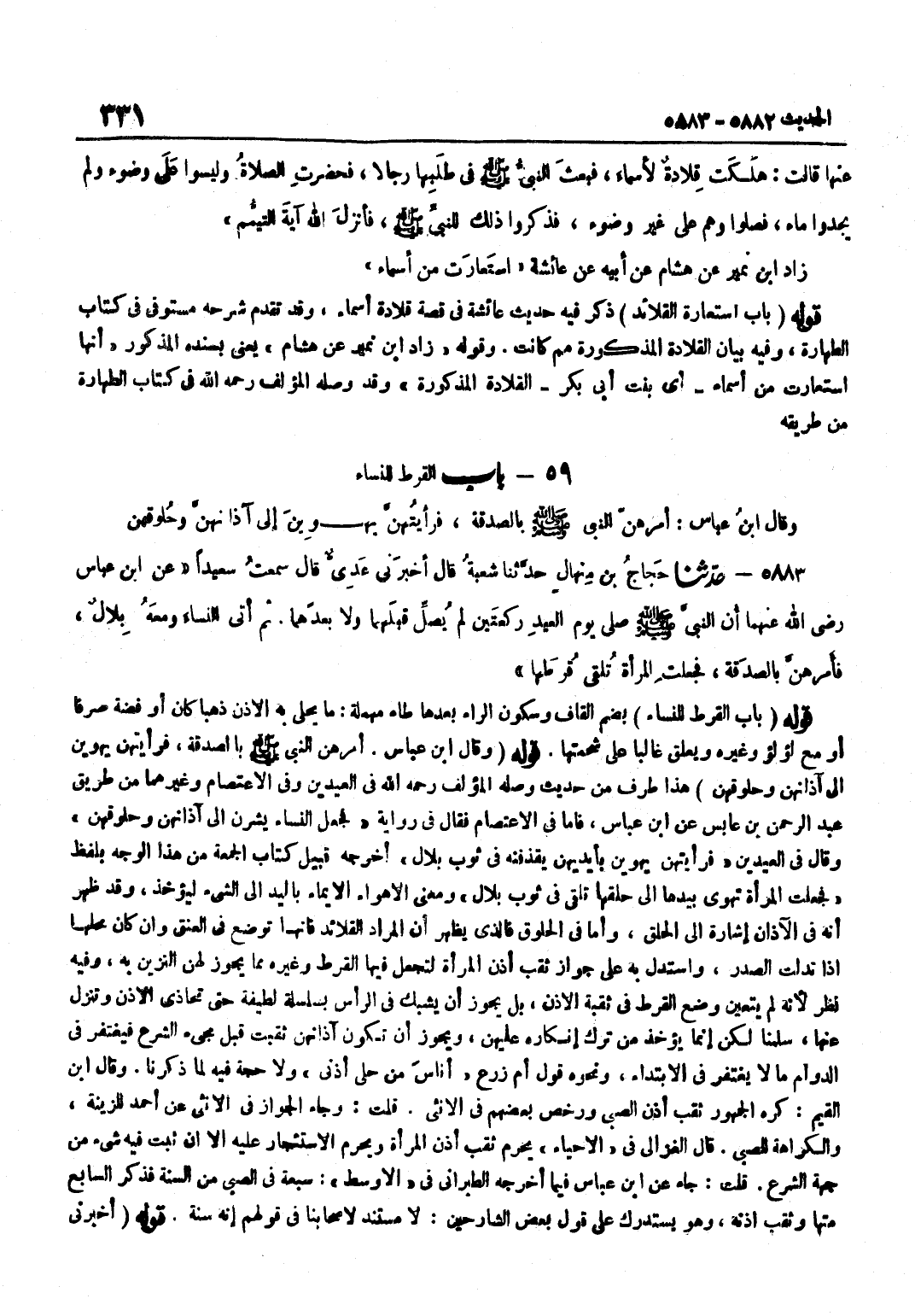[5882] زَاد بن نمير عَن هِشَام يَعْنِي بِسَنَدِهِ الْمَذْكُور أَنَّهَا استعارت من أَسمَاء أَي بنت أبي بكر القلادة الْمَذْكُورَة وَقد وَصله الْمُؤلف رَحمَه الله فِي كتاب الطَّهَارَة من طَرِيقه