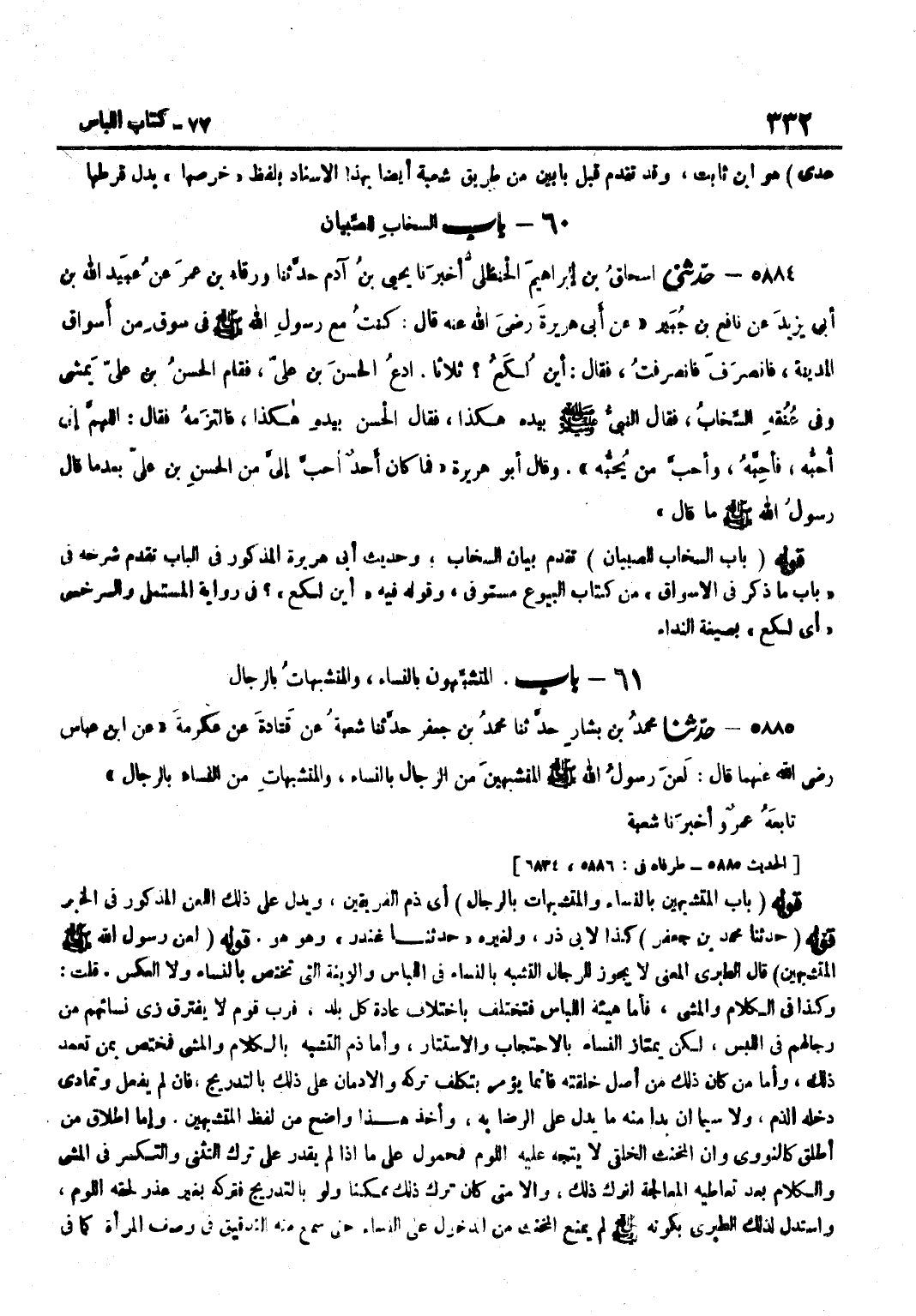 [5885] قَوْلُهُ حَدَّثَنَا مُحَمَّدُ بْنُ جَعْفَرٍ كَذَا لِأَبِي ذَرٍّ وَلِغَيْرِهِ حَدَّثَنَا غُنْدَرٌ وَهُوَ هُوَ قَوْلُهُ لَعَنَ رَسُولُ اللَّهِ صَلَّى اللَّهُ عَلَيْهِ وَسَلَّمَ الْمُتَشَبِّهِينَ قَالَ الطَّبَرِيُّ الْمَعْنَى لَا يَجُوزُ لِلرِّجَالِ التَّشَبُّهُ بِالنِّسَاءِ فِي اللِّبَاسِ وَالزِّينَةِ الَّتِي تَخْتَصُّ بِالنِّسَاءِ وَلَا الْعَكْسُ قُلْتُ وَكَذَا فِي الْكَلَامِ وَالْمَشْيِ فَأَمَّا هَيْئَةُ اللِّبَاسِ فَتَخْتَلِفُ بِاخْتِلَافِ عَادَةِ كُلِّ بَلَدٍ فَرُبَّ قَوْمٍ لَا يَفْتَرِقُ زِيُّ نِسَائِهِمْ مِنْ رِجَالِهِمْ فِي اللُّبْسِ لَكِنْ يَمْتَازُ النِّسَاءُ بِالِاحْتِجَابِ وَالِاسْتِتَارِ وَأَمَّا ذَمُّ التَّشَبُّهِ بِالْكَلَامِ وَالْمَشْيِ فَمُخْتَصٌّ بِمَنْ تَعَمَّدَ ذَلِكَ وَأَمَّا مَنْ كَانَ ذَلِكَ مِنْ أَصْلِ خِلْقَتِهِ فَإِنَّمَا يُؤْمَرُ بِتَكَلُّفِ تَرْكِهِ وَالْإِدْمَانِ عَلَى ذَلِكَ بِالتَّدْرِيجِ فَإِنْ لَمْ يَفْعَلْ وَتَمَادَى دَخَلَهُ الذَّمُّ وَلَا سِيَّمَا إِنْ بَدَا مِنْهُ مَا يَدُلُّ عَلَى الرِّضَا بِهِ وَأَخْذُ هَذَا وَاضِحٌ مِنْ لَفْظِ الْمُتَشَبِّهِينَ وَأَمَّا إِطْلَاقُ مَنْ أَطْلَقَ كَالنَّوَوِيِّ وَأَنَّ الْمُخَنَّثَ الْخِلْقِيَّ لَا يَتَّجِهُ عَلَيْهِ اللَّوْمُ فَمَحْمُولٌ عَلَى مَا إِذَا لَمْ يَقْدِرْ عَلَى تَرْكِ التَّثَنِّي وَالتَّكَسُّرِ فِي الْمَشْيِ وَالْكَلَامِ بَعْدَ تَعَاطِيهِ الْمُعَالَجَةَ لِتَرْكِ ذَلِكَ وَإِلَّا مَتَى كَانَ تَرْكُ ذَلِكَ مُمْكِنًا وَلَوْ بِالتَّدْرِيجِ فَتَرَكَهُ بِغَيْرِ عُذْرٍ لَحِقَهُ اللَّوْمُ وَاسْتَدَلَّ لِذَلِكَ الطَّبَرِيُّ بِكَوْنِهِ صَلَّى اللَّهُ عَلَيْهِ وَسَلَّمَ لَمْ يَمْنَعِ الْمُخَنَّثَ مِنَ الدُّخُولِ عَلَى النِّسَاءِ حَتَّى سَمِعَ مِنْهُ التَّدْقِيقَ فِي وَصْفِ الْمَرْأَةِ كَمَا فِي